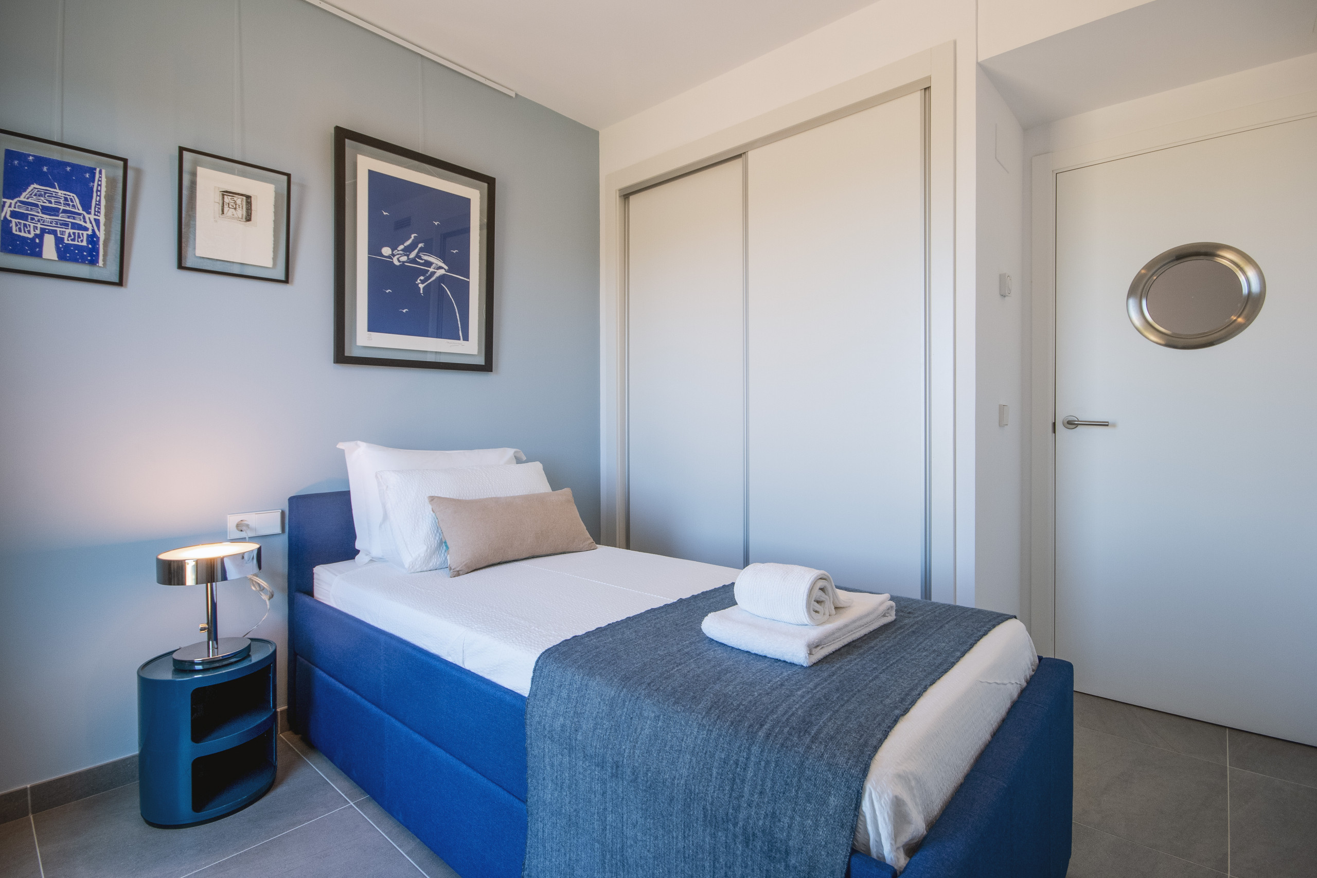 Im Inneren der Wohnung werden die Gäste von hell gekalkten Wänden, sonnigen Kunstwerken und schönen dekorativen Elementen aus Rattan und Strandtönen empfangen. Der geräumige Wohn- und Essbereich und die Küche führen zu einem großen überdachten Balkon mit Esstisch im Freien und bequemen Sitzgelegenheiten. Die eleganten Schlafzimmer verfügen über eingebaute Schränke und hochwertige Betten mit gepolsterten Kopfteilen. Die Kalt-/Warmluft-Klimaanlage ist über ein Kanalsystem in der gesamten Immobilie verteilt, was sie zu einem komfortablen Ort für die Unterkunft während des ganzen Jahres macht.