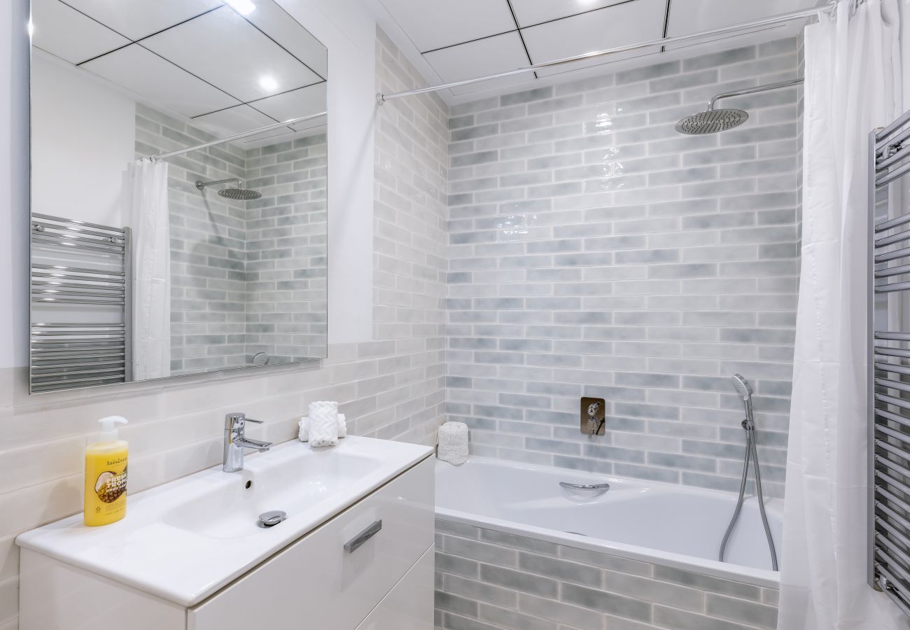 Im Inneren ist der Salon klein, aber perfekt gestaltet und von einem bodentiefen Balkon aus belichtet, der auf die Dächer des Komplexes Pueblo Blanco II blickt. In derselben Etage verfügt das große Schlafzimmer über einen eigenen Balkon mit Meerblick und ein herrliches, komplettes Badezimmer en suite mit einer großen bodengleichen Dusche, einem praktischen Schminktisch und wunderschönen gemusterten Fliesen.