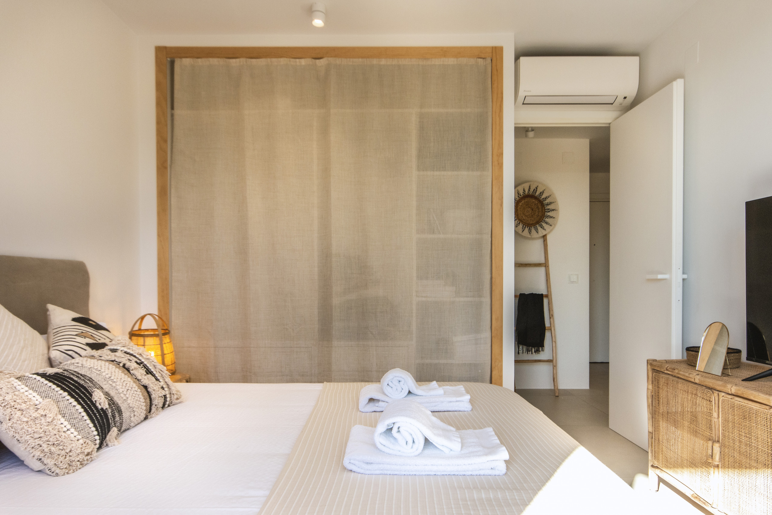 Im Inneren ist die Wohnung hell, geräumig und verfügt über alle notwendigen Annehmlichkeiten für einen entspannenden Aufenthalt. Eine große bodengleiche Dusche ist das perfekte Gegenmittel für einen Tag am heißen Strand, während das weiß getünchte Schlafzimmer, ausgestattet mit Deckenventilator und schönen Leinenvorhängen, der perfekte Zufluchtsort für ein Nickerchen am Nachmittag ist. Die Küche ist vollständig ausgestattet und bietet viel Platz für kulinarische Gäste. Das gemütliche Wohn-/Esszimmer bietet bequeme Sitzmöglichkeiten, Klimaanlage und einen Fernseher in Kinogröße. Das Glasfaserinternet ist ein weiterer großer Vorteil, da es mobilen Arbeitern und Internetnutzern ermöglicht, sich schnell mit www zu verbinden.