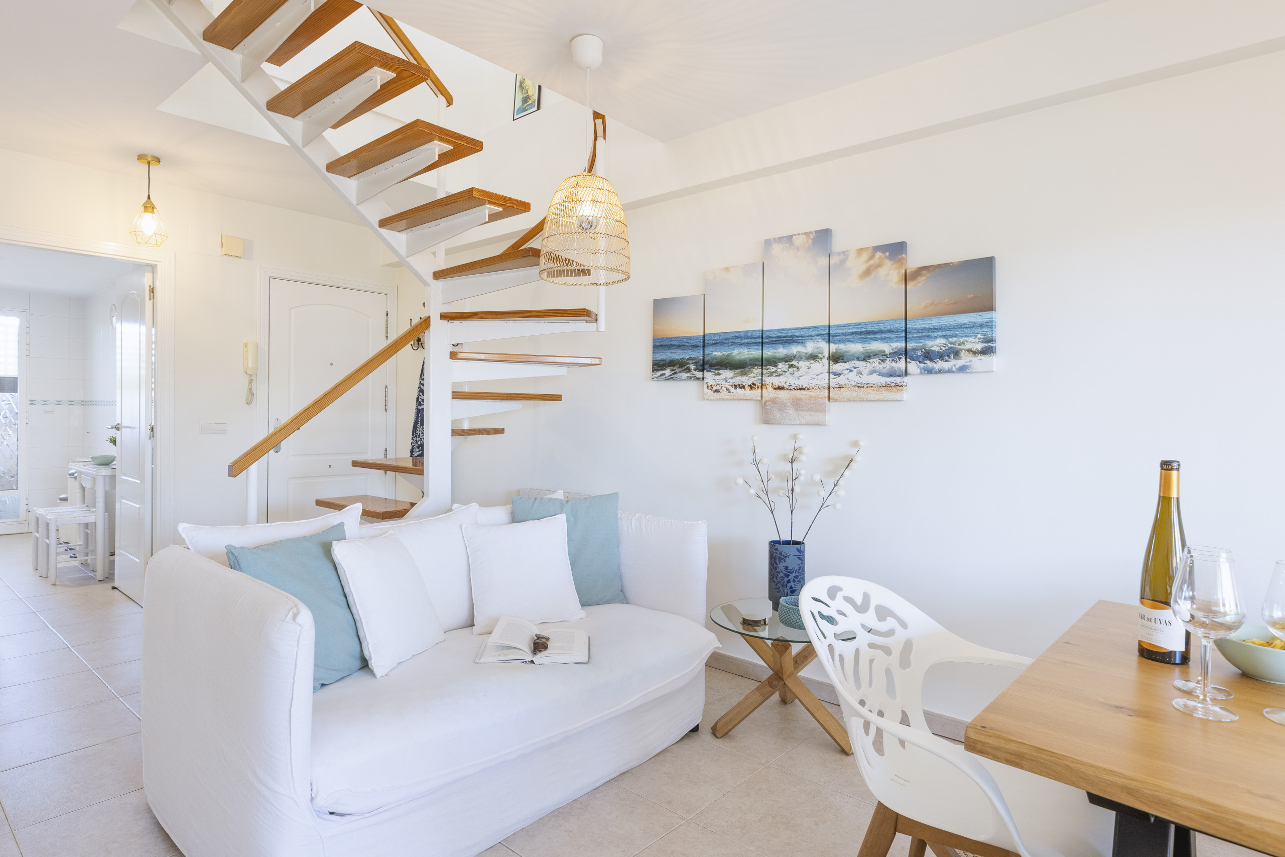 Diese charmante Zweizimmerwohnung über zwei Etagen ist wunderschön mit weißen und Strandholzmöbeln, Lampen und Rattanaccessoires sowie pastellfarbenen Möbeln dekoriert, die einen sofort ans Meer erinnern, sobald man die Eingangstür überschreitet.