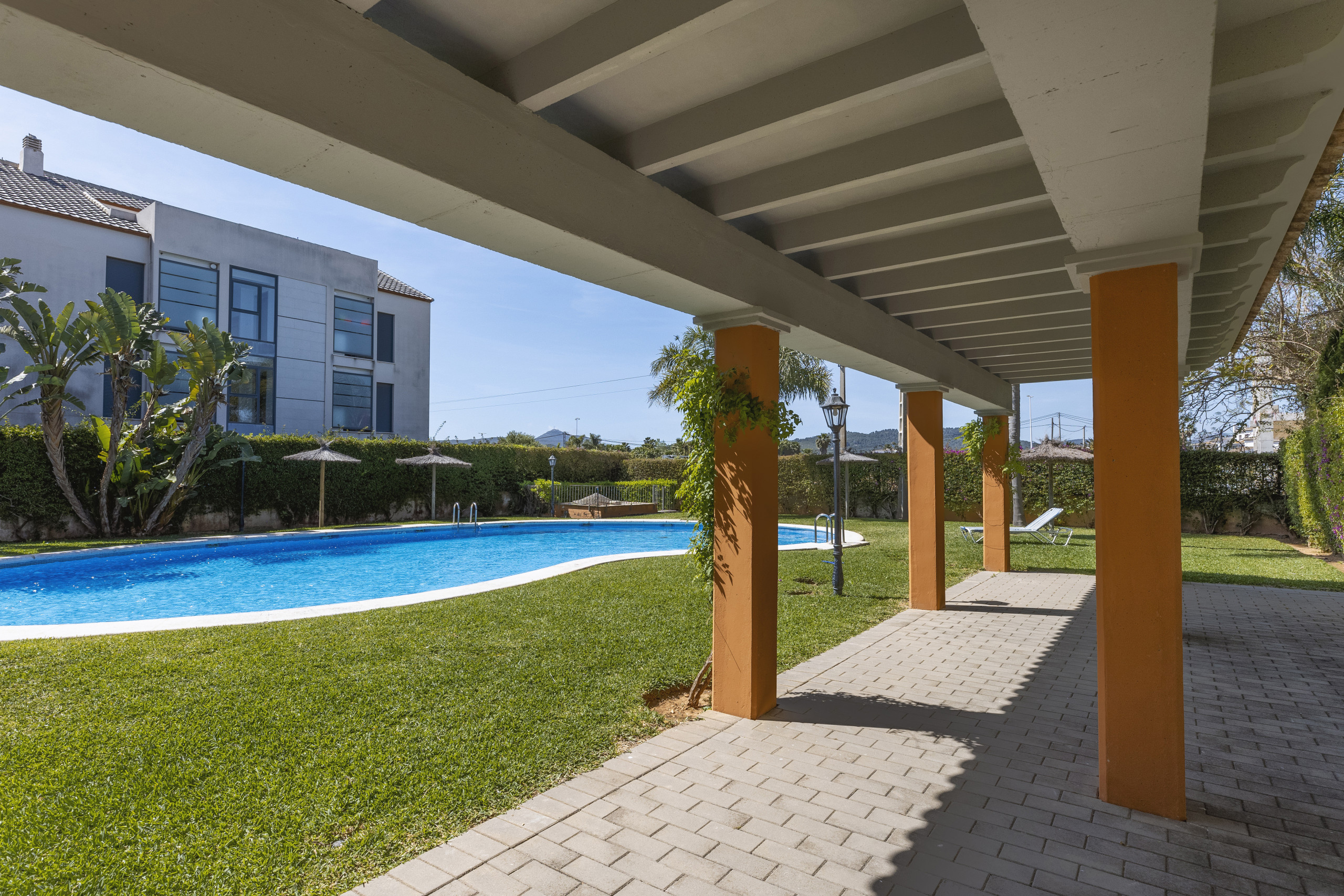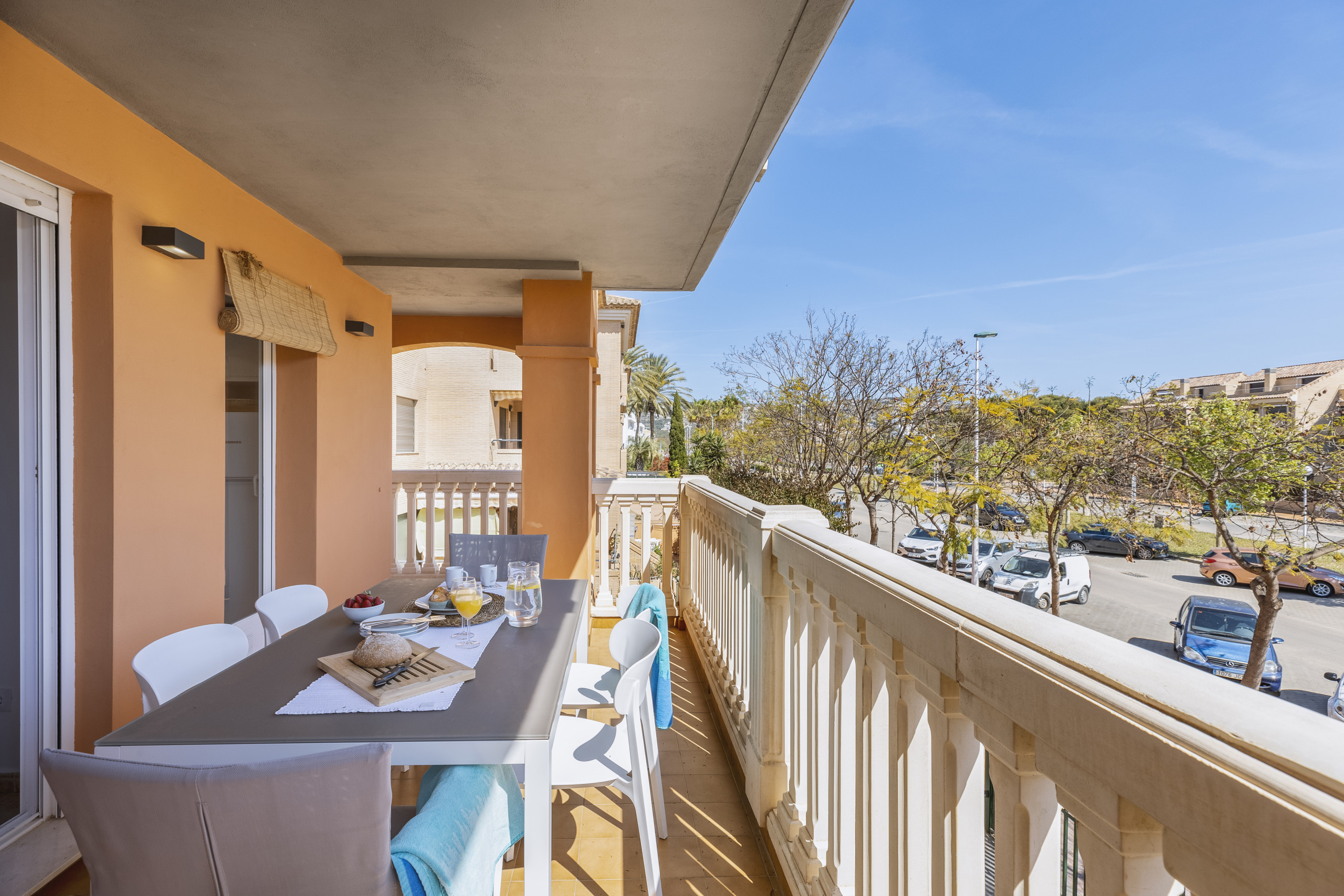 Im Inneren der Wohnung werden die Gäste von hell gekalkten Wänden, sonnigen Kunstwerken und schönen dekorativen Elementen aus Rattan und Strandtönen empfangen. Der geräumige Wohn- und Essbereich und die Küche führen zu einem großen überdachten Balkon mit Esstisch im Freien und bequemen Sitzgelegenheiten. Die eleganten Schlafzimmer verfügen über eingebaute Schränke und hochwertige Betten mit gepolsterten Kopfteilen. Die Kalt-/Warmluft-Klimaanlage ist über ein Kanalsystem in der gesamten Immobilie verteilt, was sie zu einem komfortablen Ort für die Unterkunft während des ganzen Jahres macht.