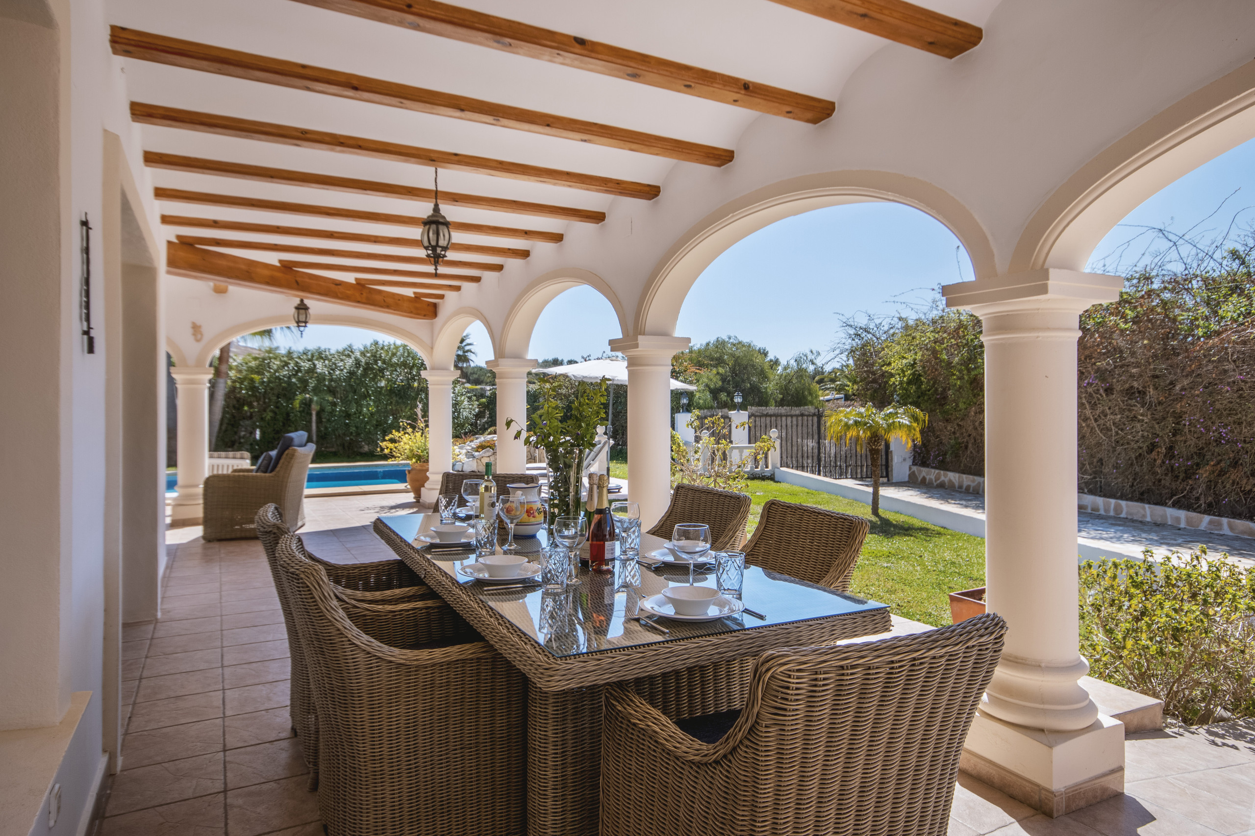 Im Freien ist das Sommerleben besonders gut mit nach Süden ausgerichteten möblierten Terrassen und der großen, sonnigen Poolzone zum Sonnenbaden und Entspannen ausgestattet. Die ummauerten und geschlossenen Gärten bestehen teils aus Rasen und teils aus Kies, bepflanzt mit Palmen, blühenden Sträuchern und kleinen Bäumen.