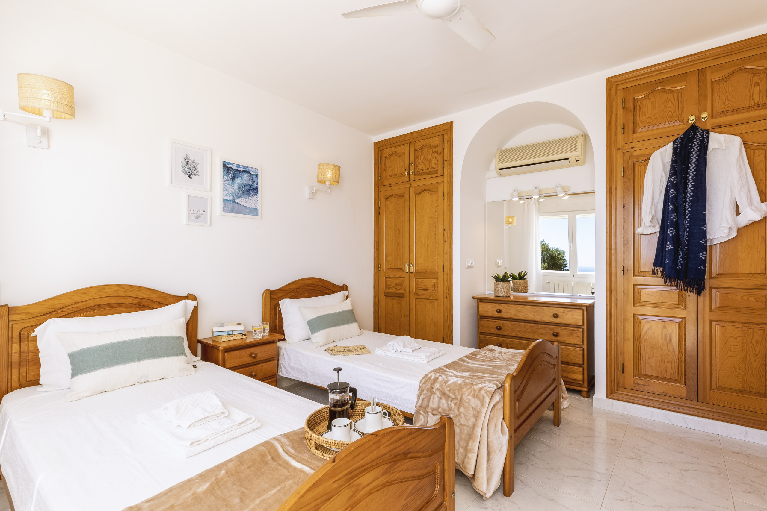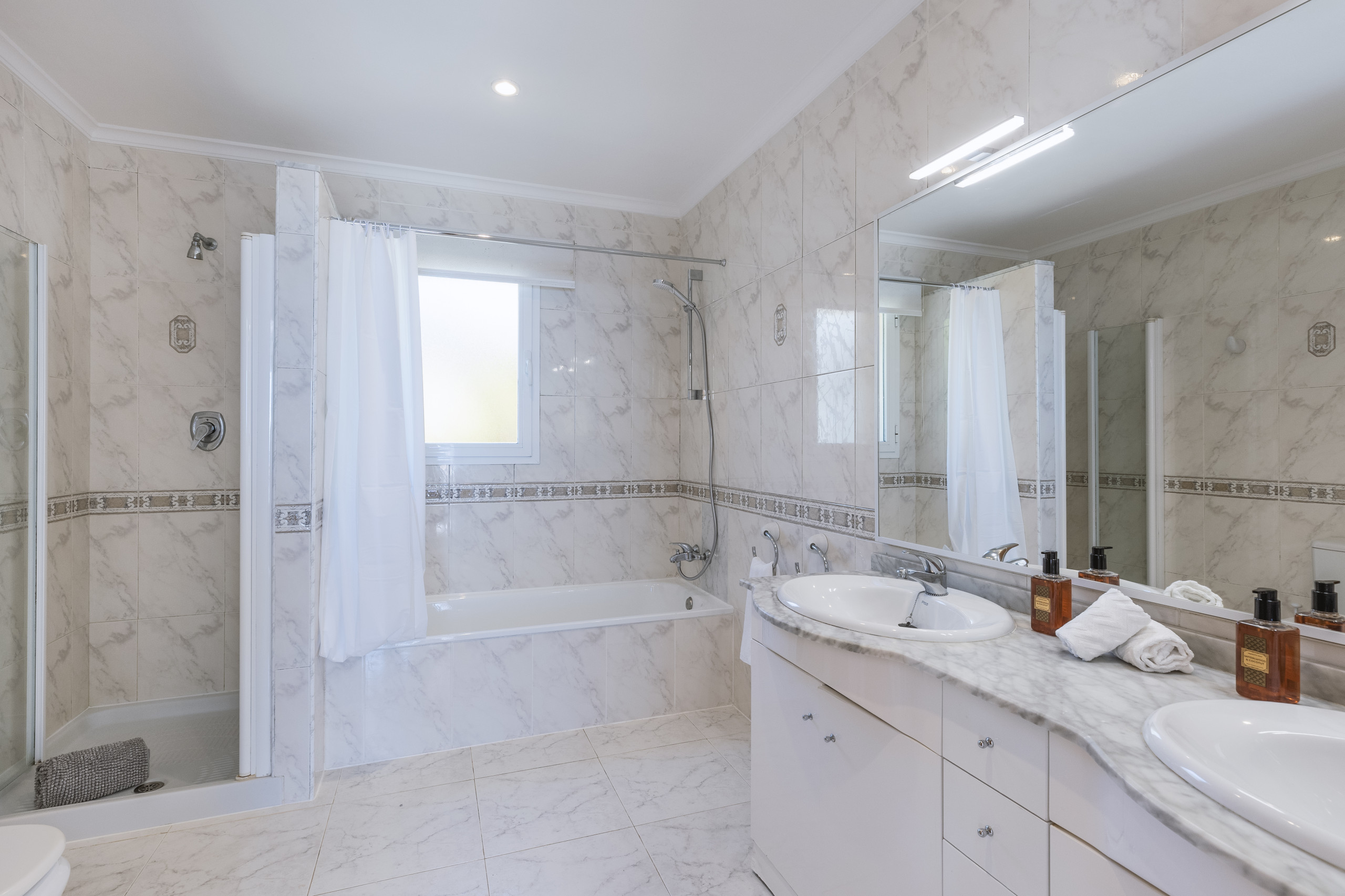 Zurück im Inneren und im Obergeschoss verfügt das Hauptschlafzimmer über ein großes Badezimmer en suite mit einer kleinen, aber perfekt gestalteten bodengleichen Dusche sowie einer Badewanne mit Wanddusche. Zwei weitere Schlafzimmer, jedes mit zwei Einzelbetten, teilen sich ein helles Familienbadezimmer. Alle drei Schlafzimmer verfügen über Kalt-/Warmklimaanlage, eingebaute Schränke und direkten Zugang zu den Balkonen im Obergeschoss.
