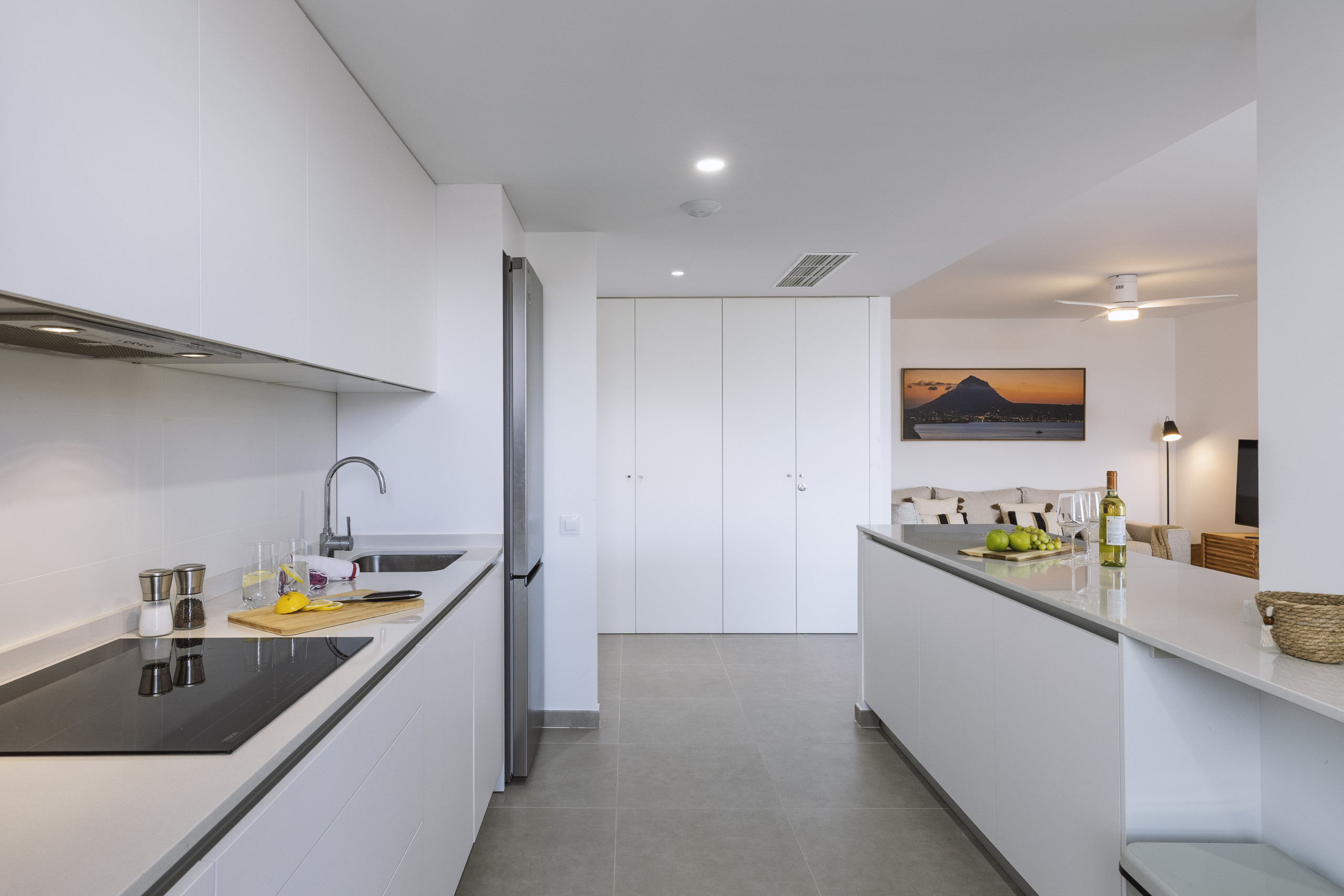 In het centrum van Aquamar bevindt zich de open leefruimte, waar een keuken in Amerikaanse stijl met een kookeiland overloopt in de eetruimte en de ontspannen zithoek met Smart TV. Een handige wasruimte met wasmachine en draadloze stofzuiger bevindt zich net naast de keuken, ideaal voor langere verblijven.