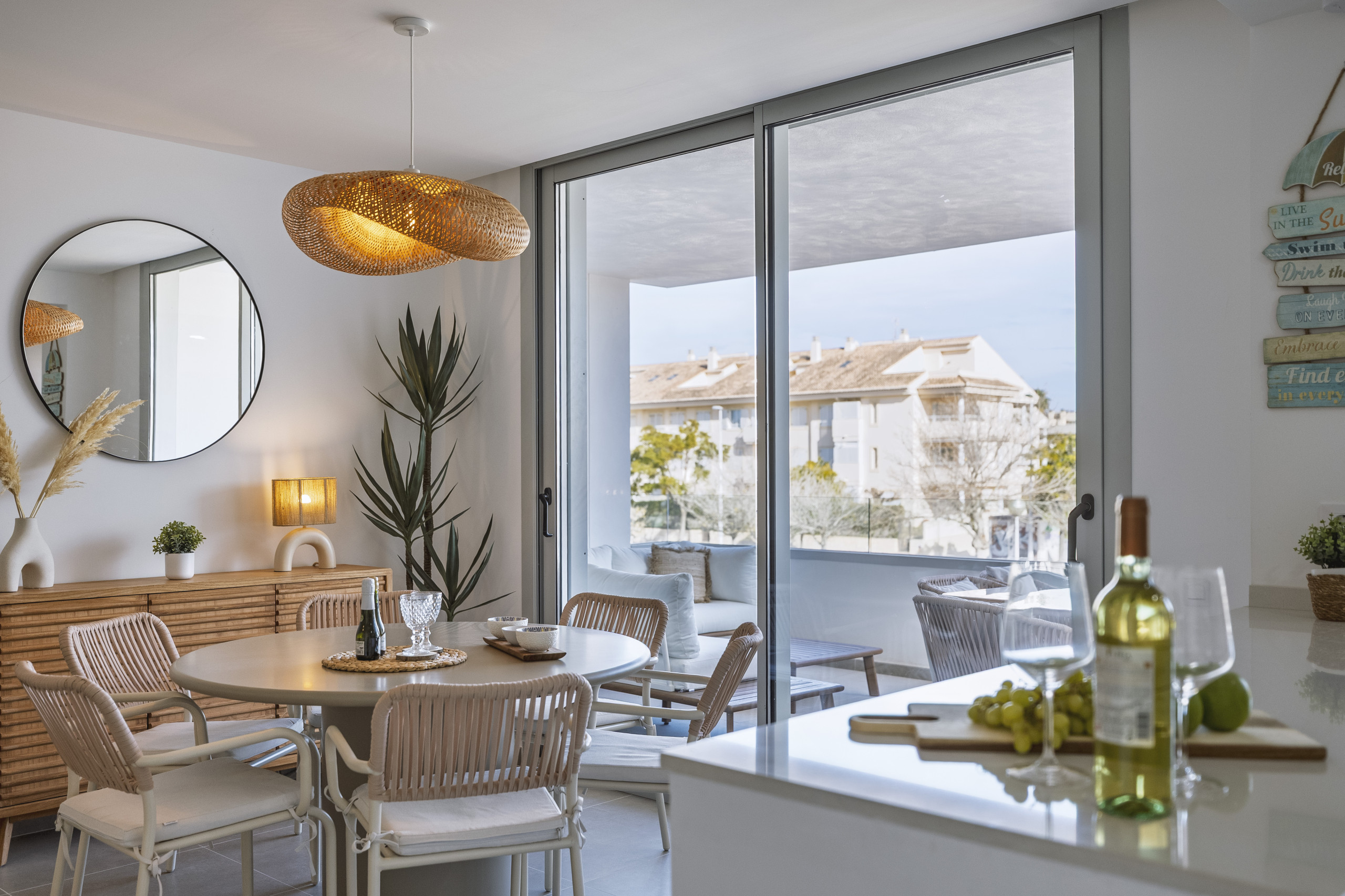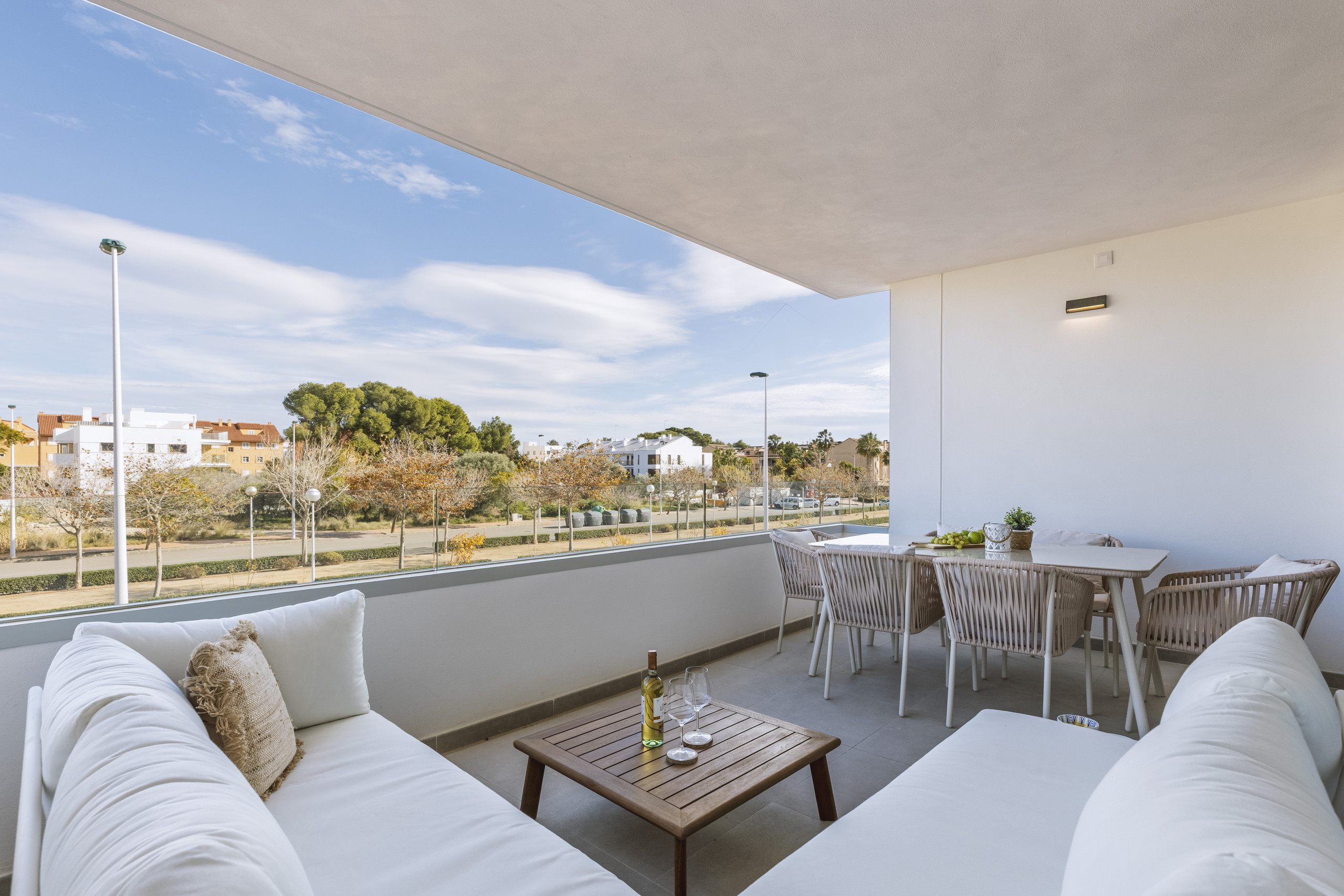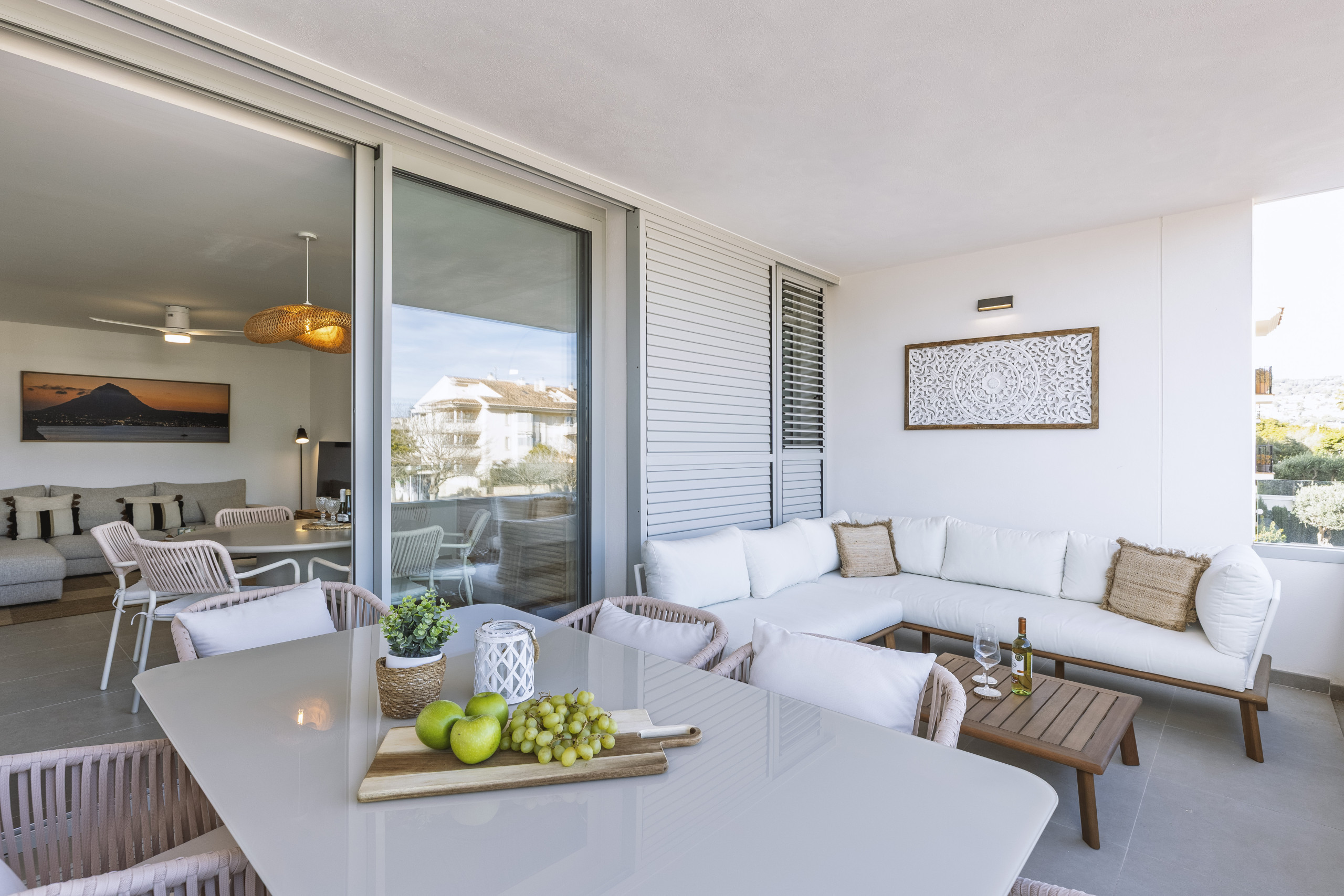 Van vloer tot plafond glazen deuren openen zich naar een ruime overdekte balkon, perfect voor rustige ontbijtjes of avonden doorgebracht buiten. Met een al fresco eettafel en een ontspannen hoekbank is het een ruimte gemaakt voor lange, ontspannen maaltijden en warme Jávea-avonden.