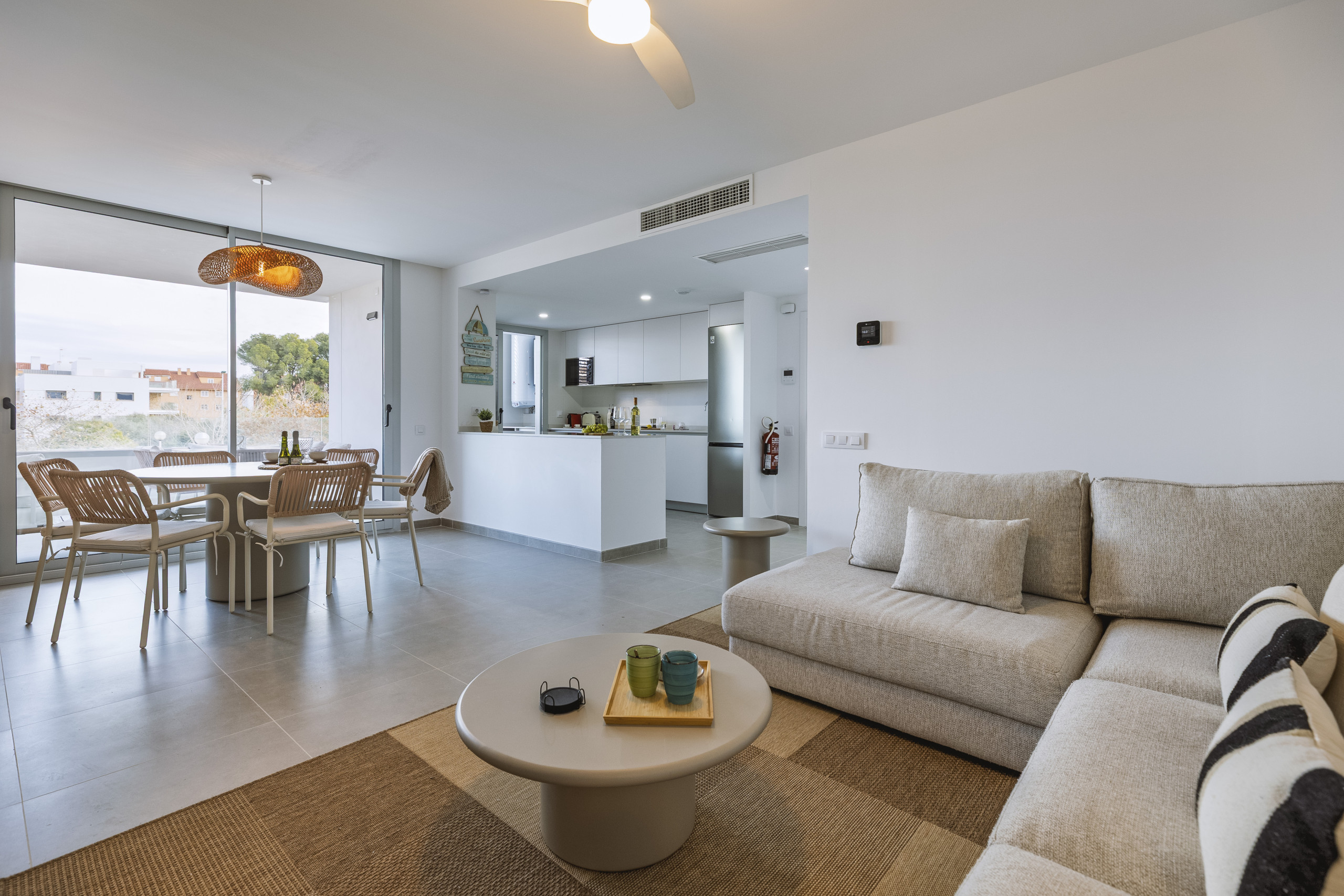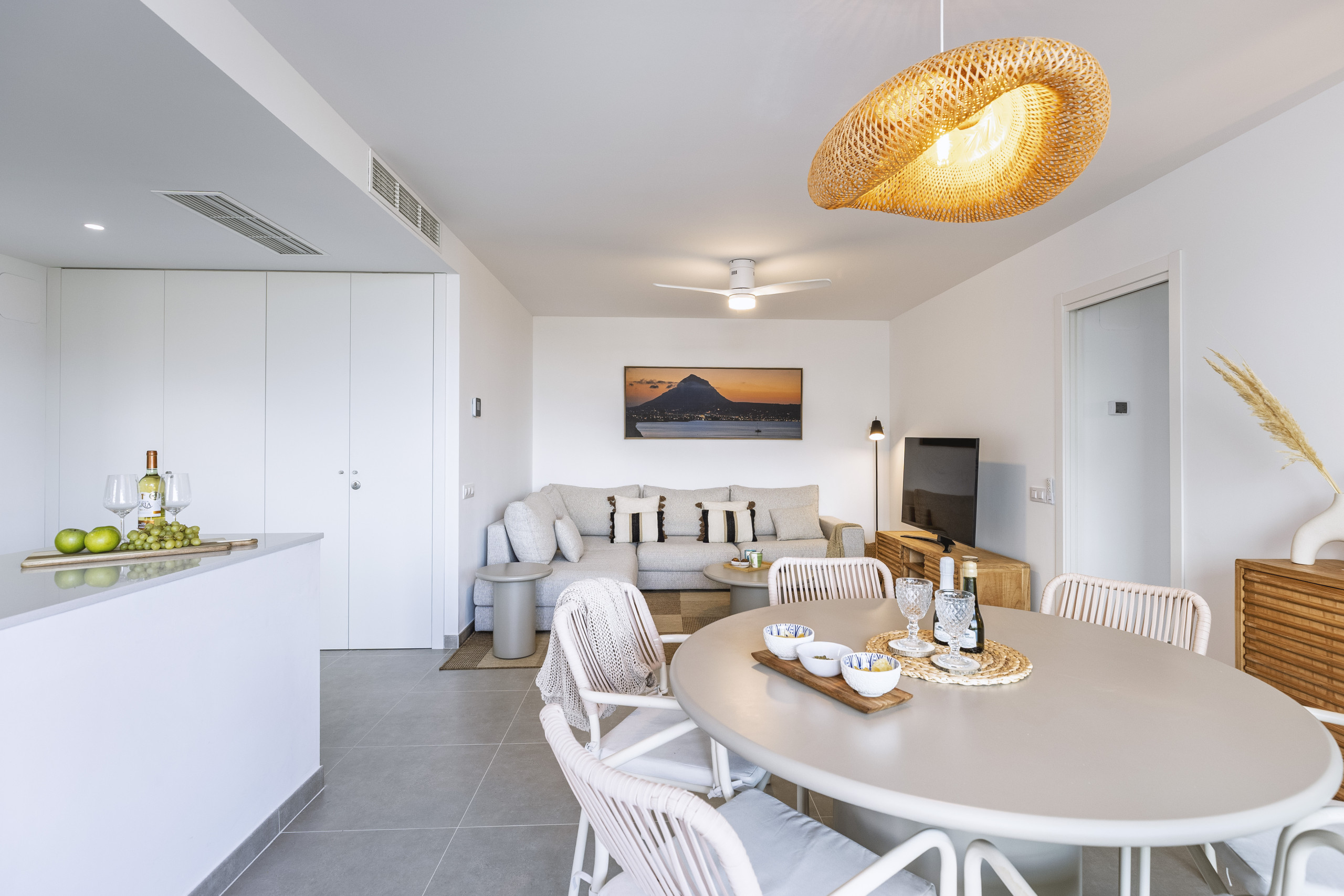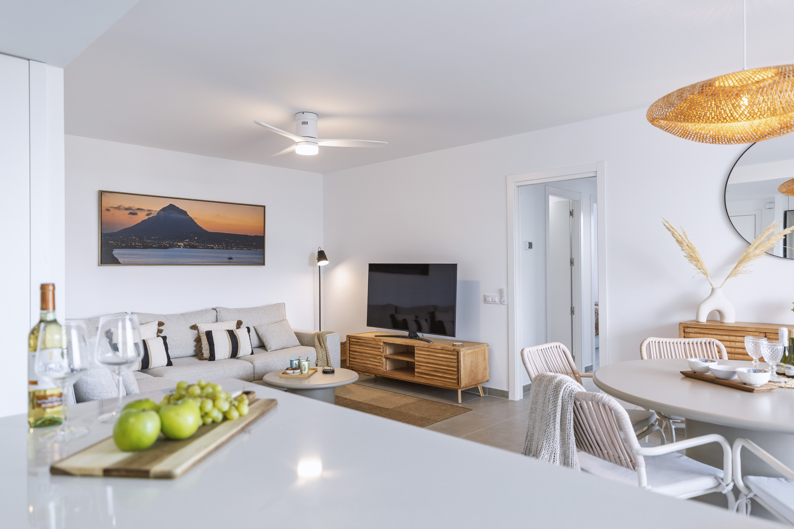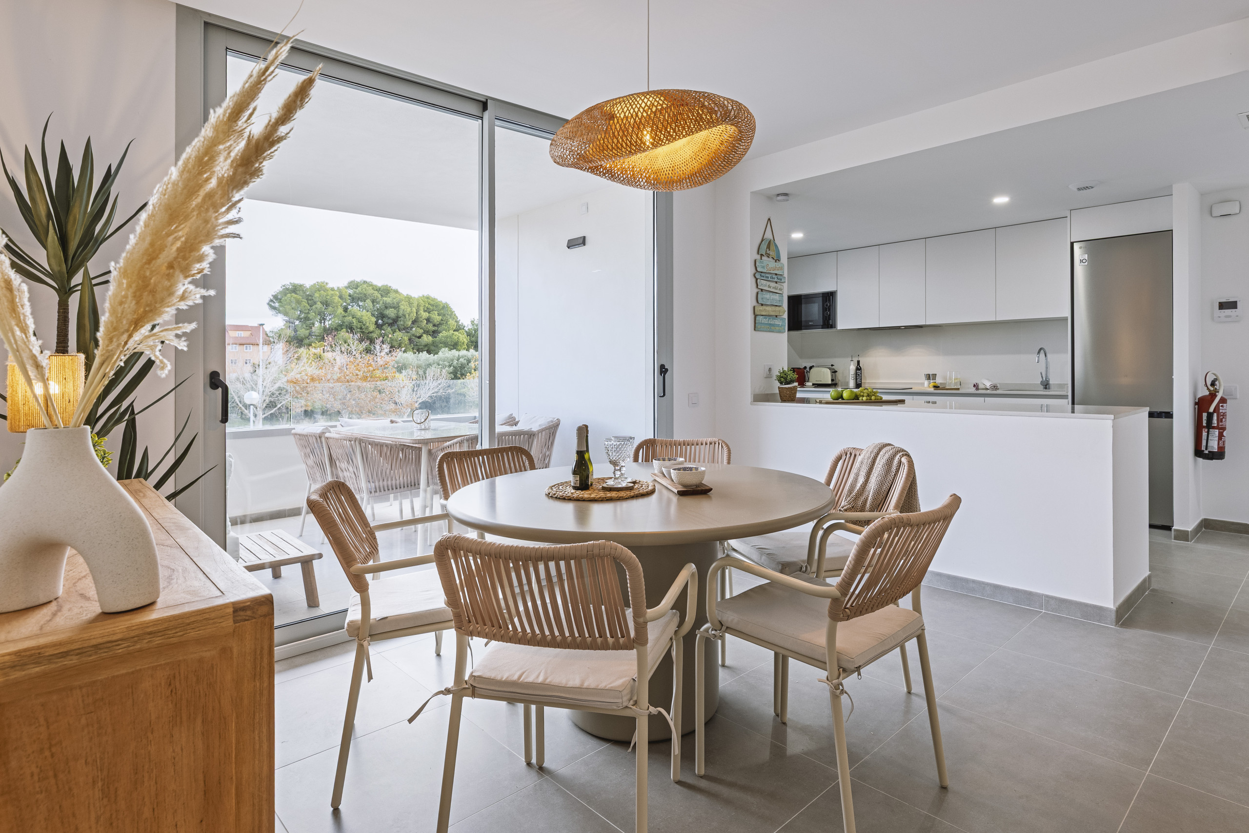 Van vloer tot plafond glazen deuren openen zich naar een ruime overdekte balkon, perfect voor rustige ontbijtjes of avonden doorgebracht buiten. Met een al fresco eettafel en een ontspannen hoekbank is het een ruimte gemaakt voor lange, ontspannen maaltijden en warme Jávea-avonden.