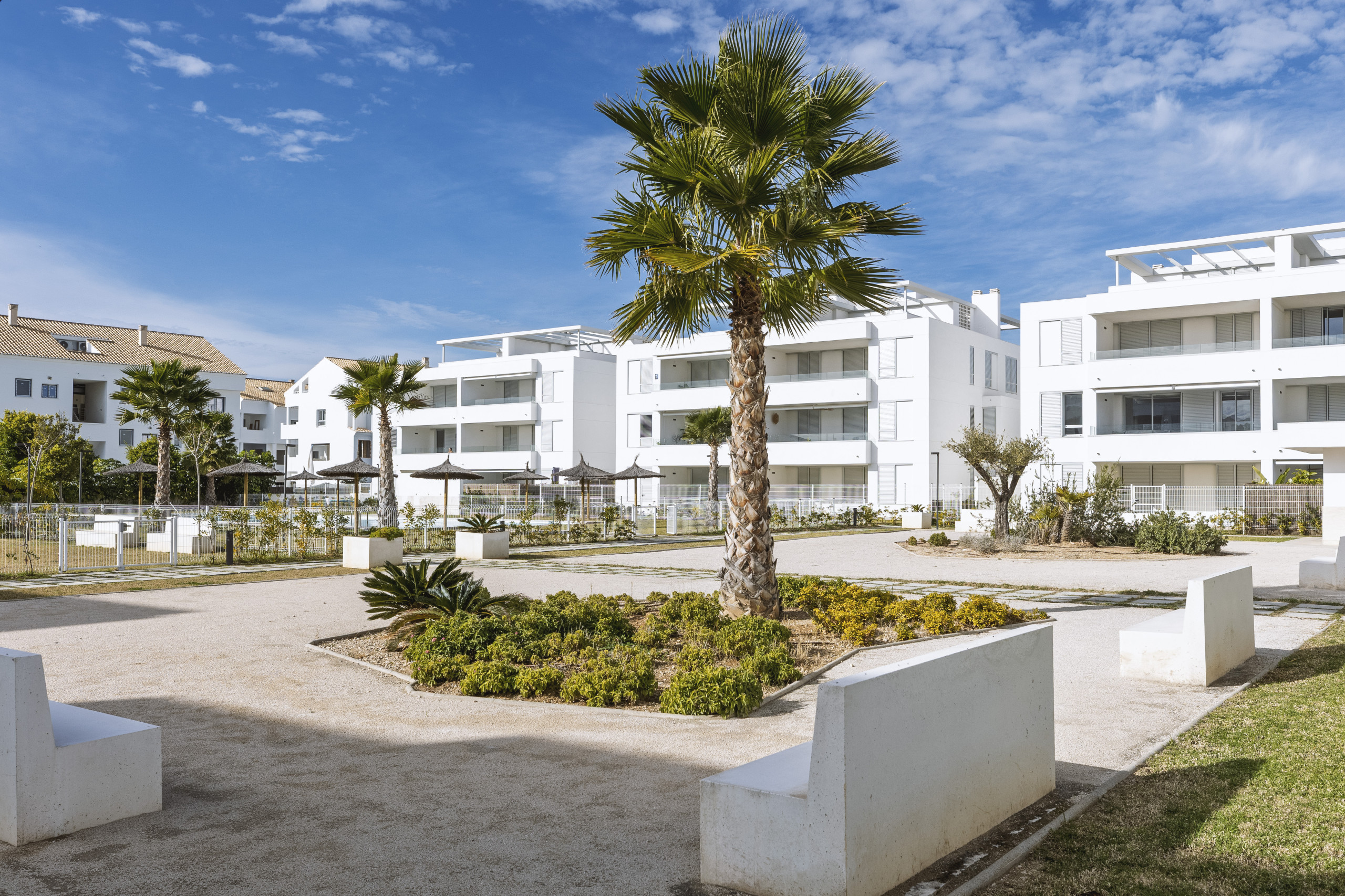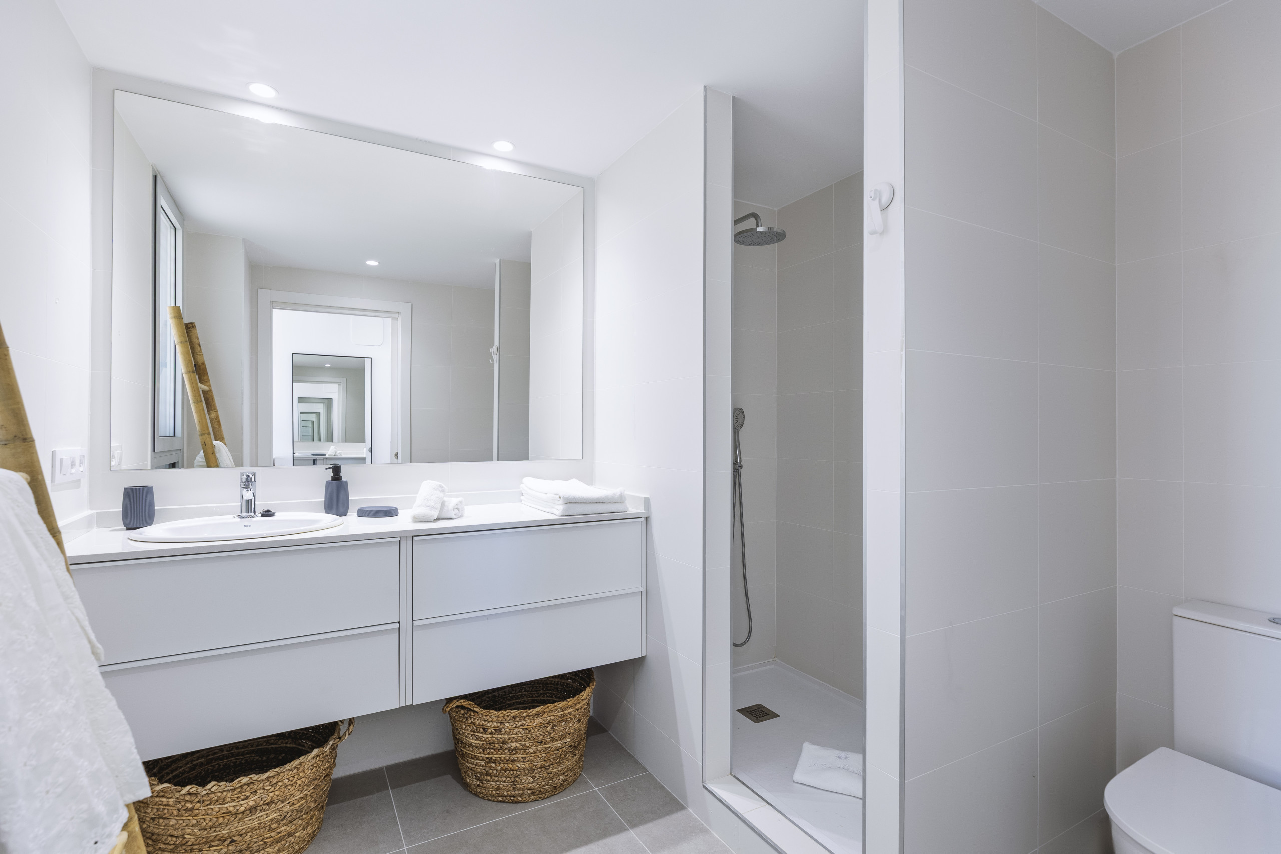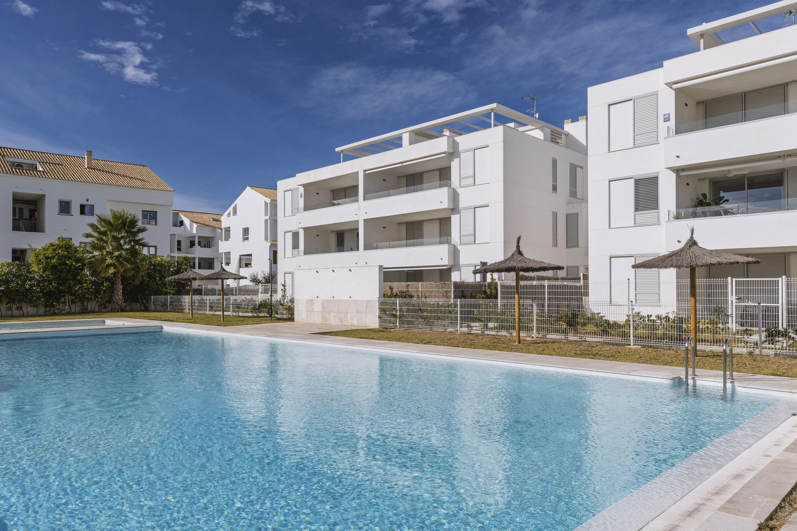 Binnen biedt de appartement drie goed geproportioneerde slaapkamers. De hoofdslaapkamer beschikt over een royaal tweepersoonsbed van 180 x 190 cm en een strak ingerichte ensuite badkamer met een inloopdouche. Een lichte tweepersoonskamer met twee bedden van 90 x 190 cm en een enkele slaapkamer met een bed van 90 x 190 cm delen een ruime gezinsbadkamer, eveneens uitgerust met een moderne inloopdouche. Centrale airconditioning voor warm en koud weer loopt door het hele appartement, wat het hele jaar door comfort garandeert.