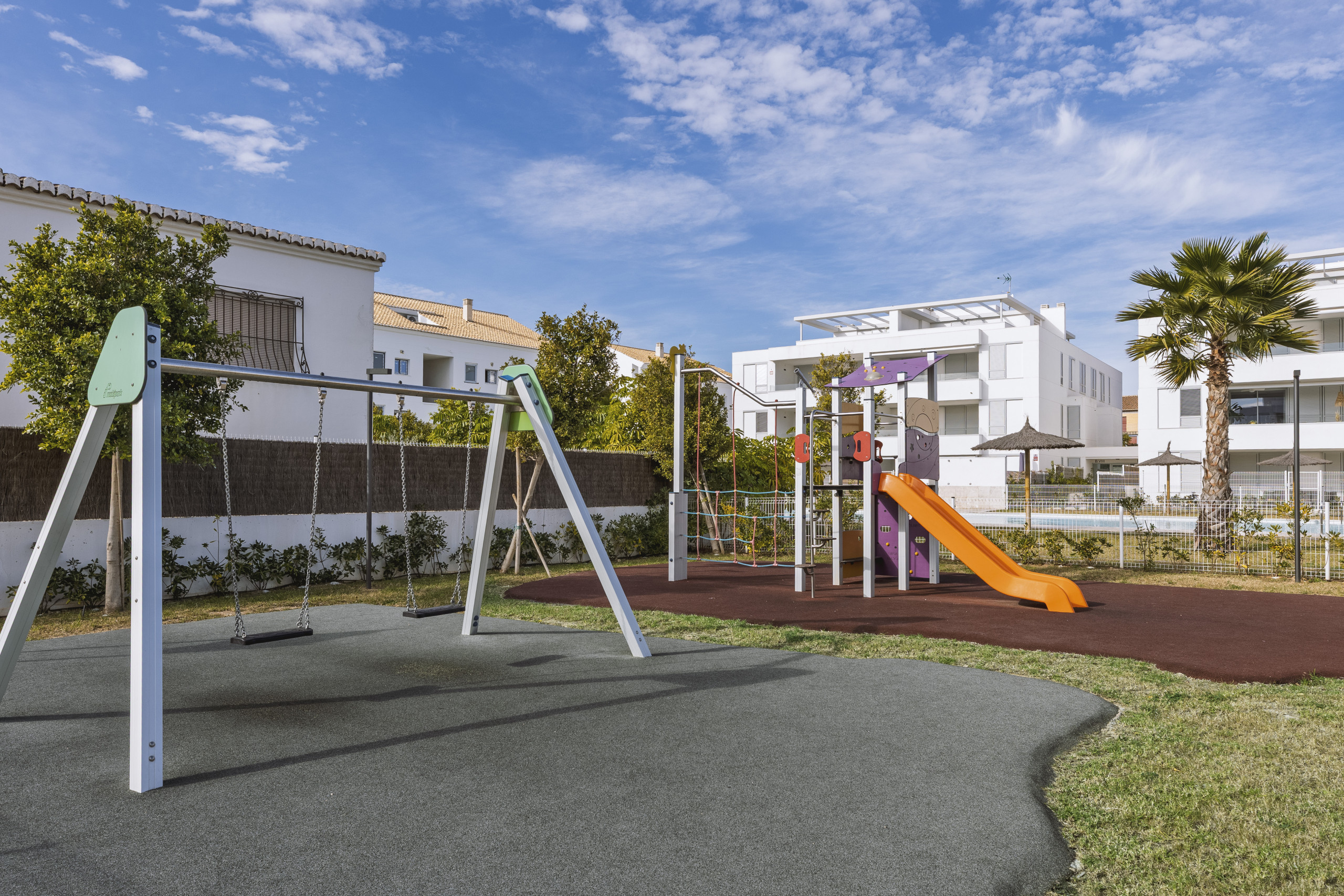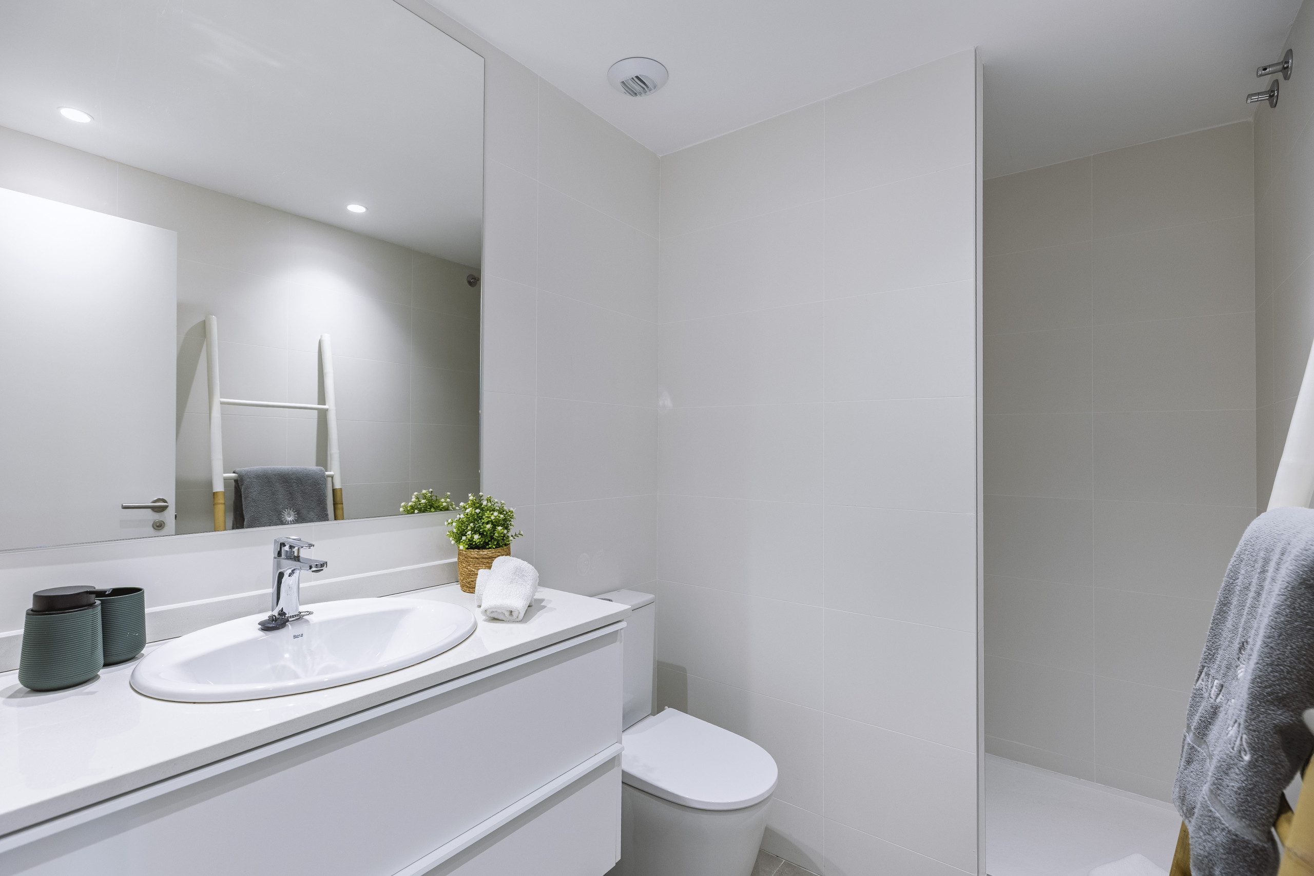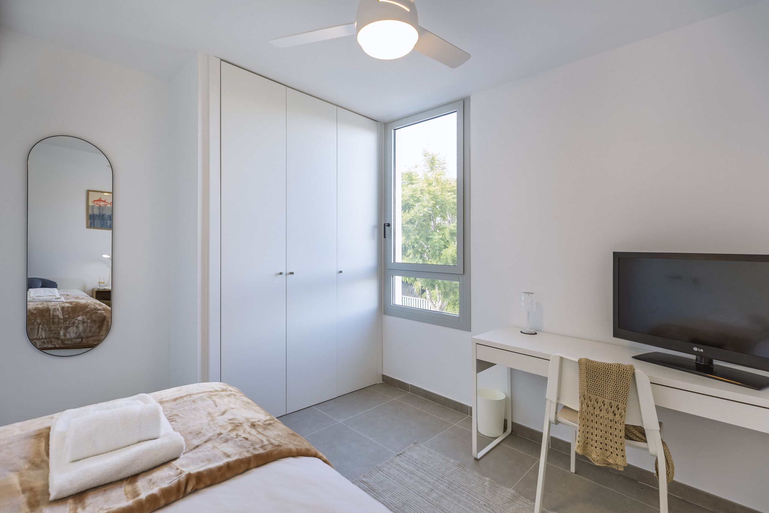 Binnen biedt de appartement drie goed geproportioneerde slaapkamers. De hoofdslaapkamer beschikt over een royaal tweepersoonsbed van 180 x 190 cm en een strak ingerichte ensuite badkamer met een inloopdouche. Een lichte tweepersoonskamer met twee bedden van 90 x 190 cm en een enkele slaapkamer met een bed van 90 x 190 cm delen een ruime gezinsbadkamer, eveneens uitgerust met een moderne inloopdouche. Centrale airconditioning voor warm en koud weer loopt door het hele appartement, wat het hele jaar door comfort garandeert.