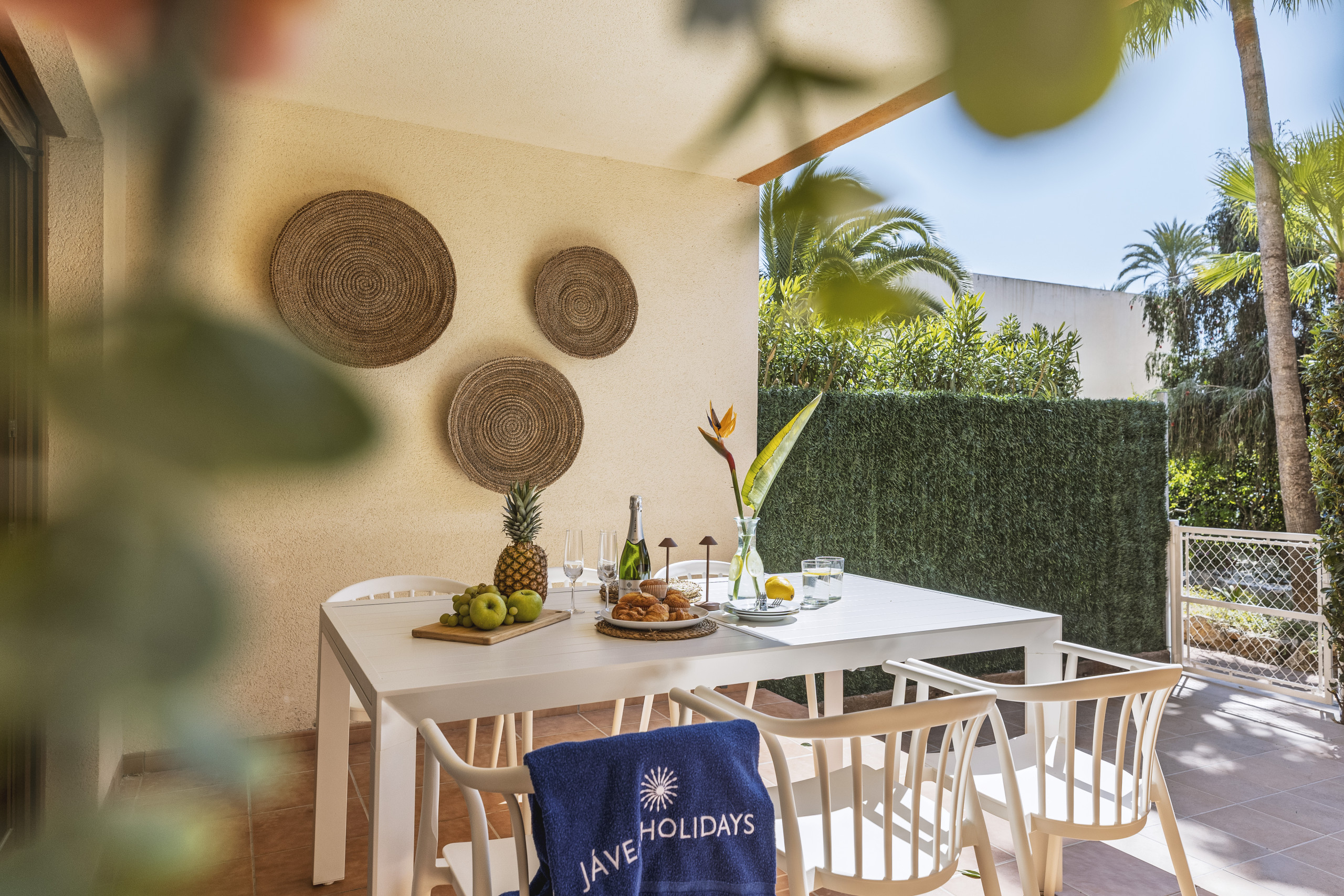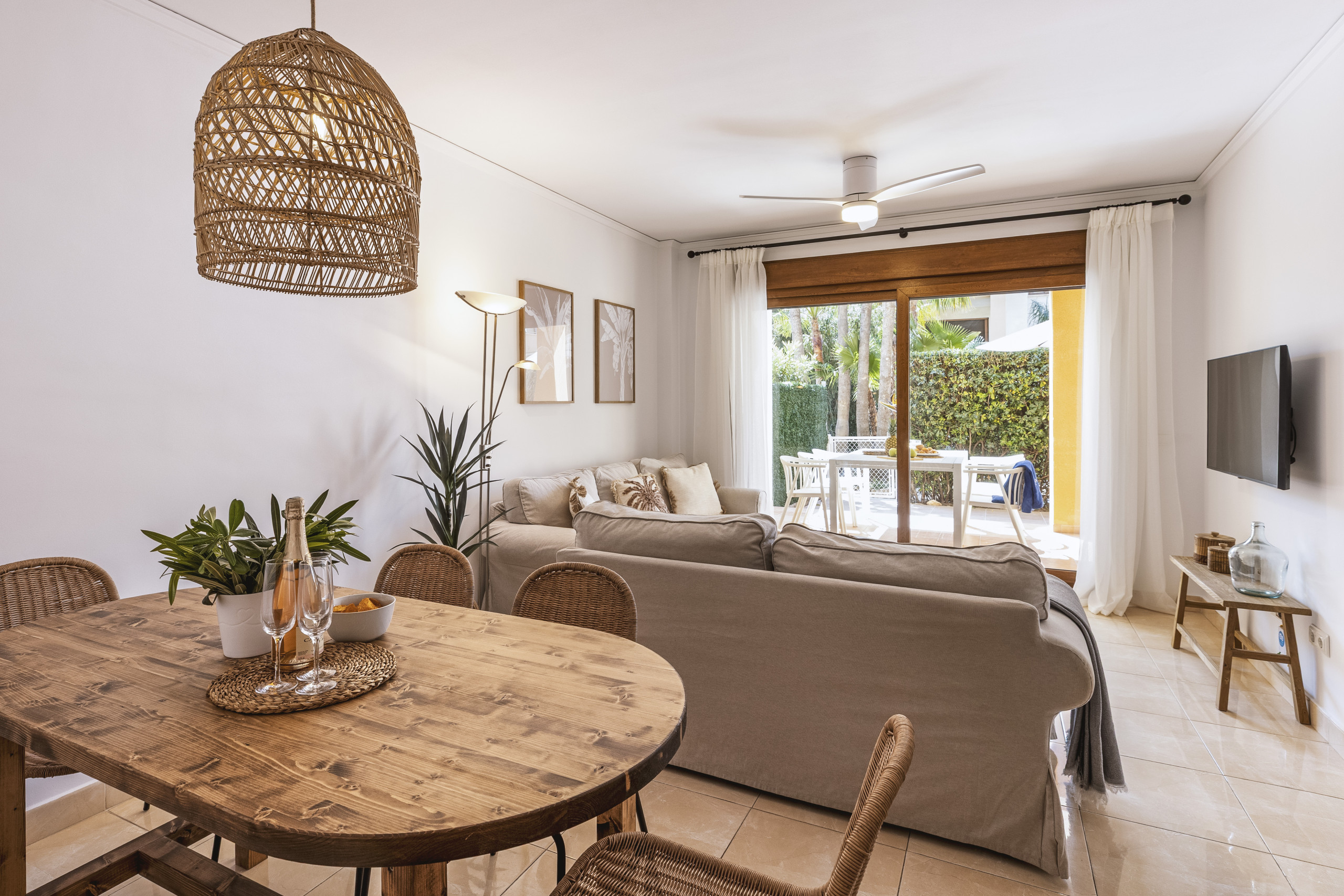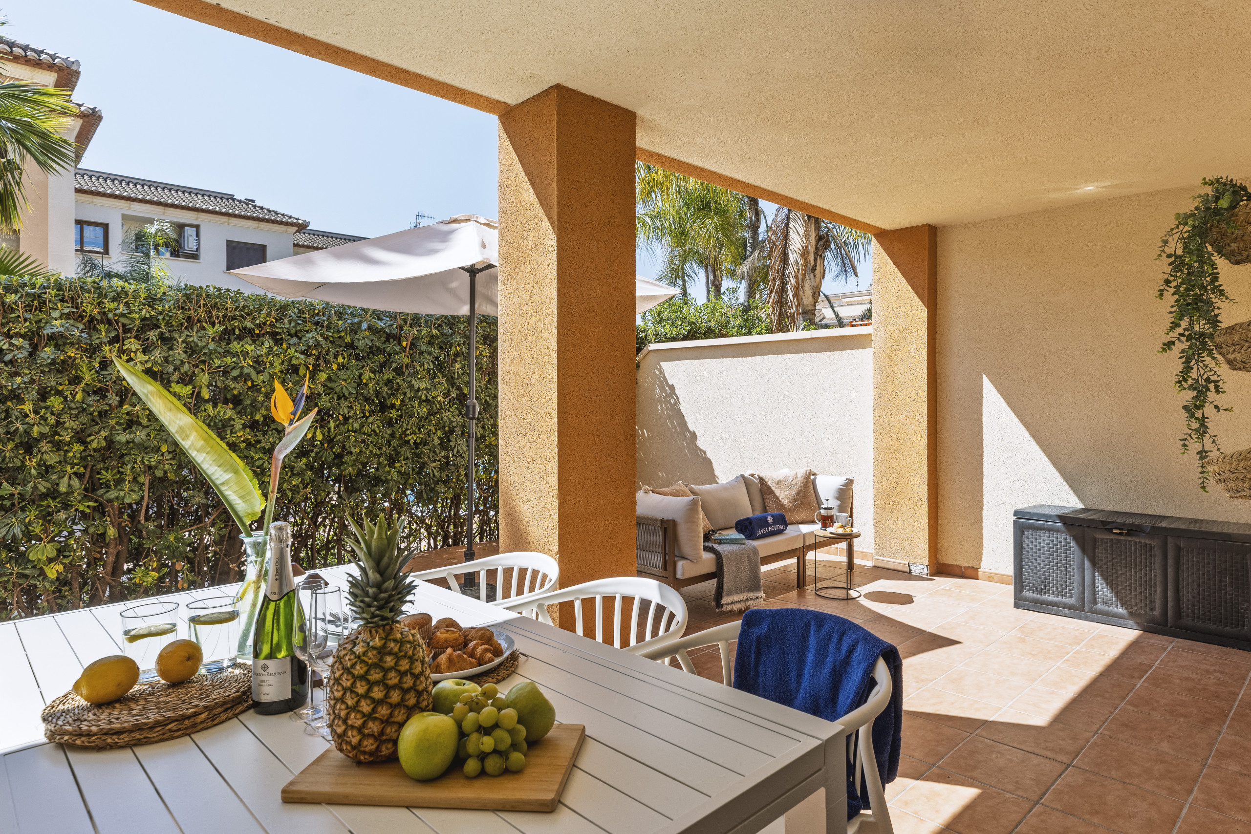 Buiten is het overdekte terras gemaakt voor trage ochtenden en lange avonden, met een buiteneetruimte en een ontspannen bank, plus een privé open gedeelte voor zonnen. Afgesloten en met directe toegang tot het gemeenschappelijke zwembad, is het vooral ideaal voor gezinnen.