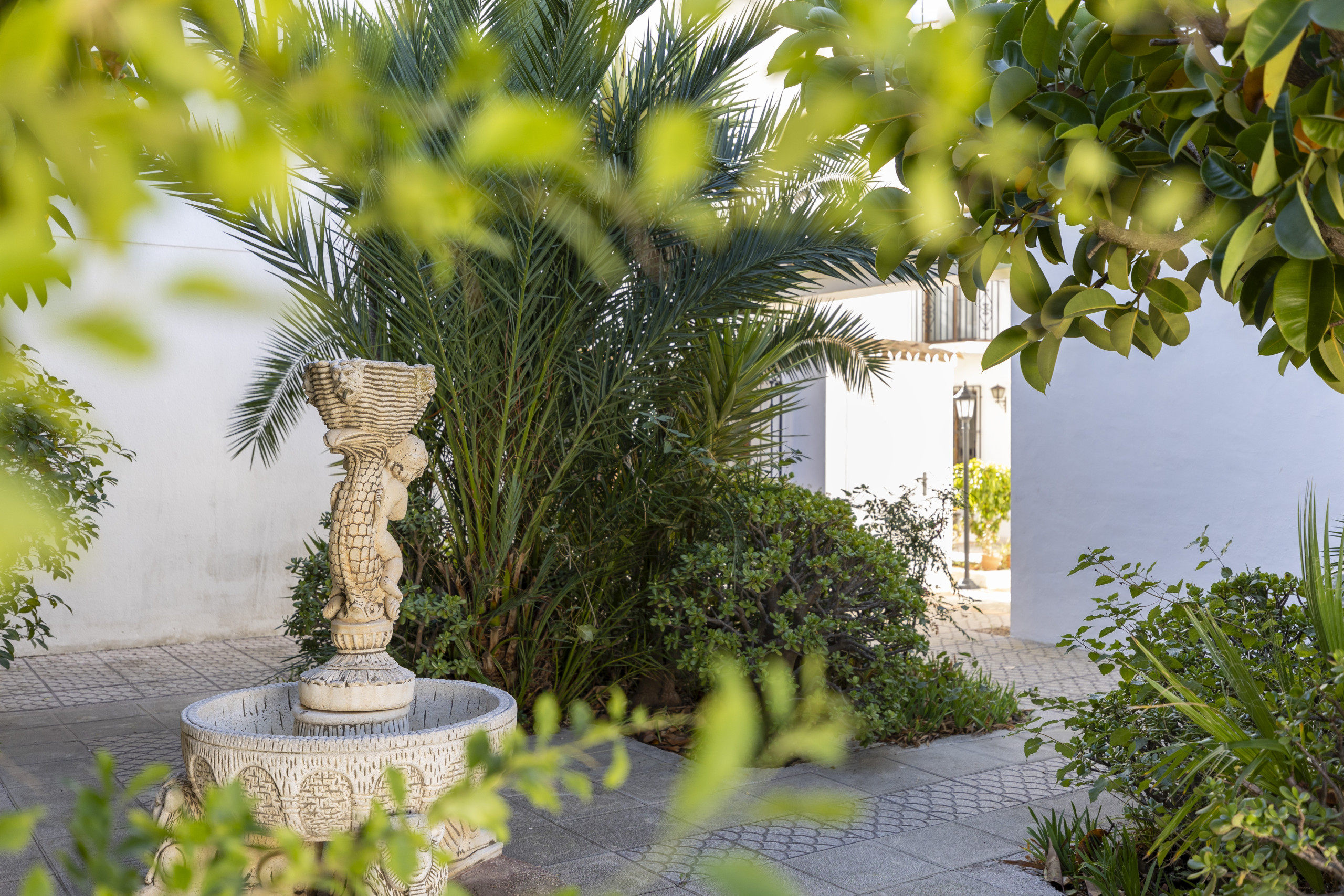Aan de binnenkant is de woonkamer klein maar perfect ingericht en overspoeld met licht vanuit een balkon op volledige hoogte dat uitkijkt op de daken van het Pueblo Blanco II-complex. Op dezelfde verdieping heeft de grote slaapkamer zijn eigen balkon, met uitzicht op zee en een prachtige complete suite-badkamer met een grote inloopdouche, een handige kaptafel en mooie gedrukte tegels.
