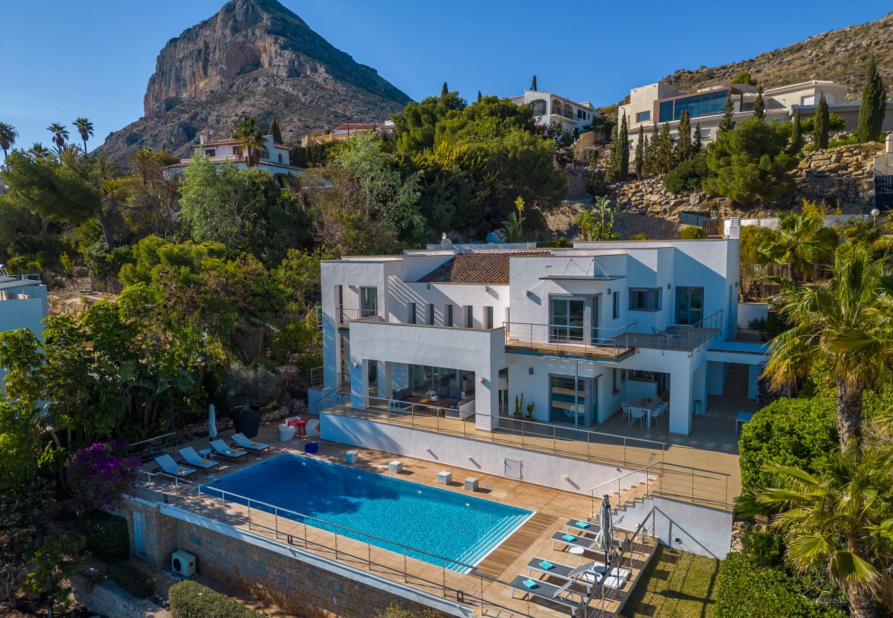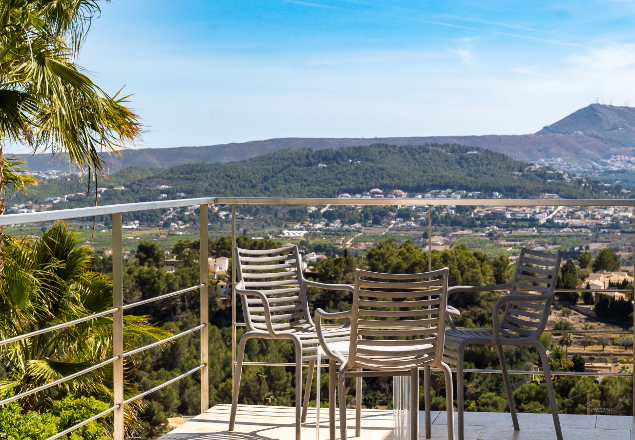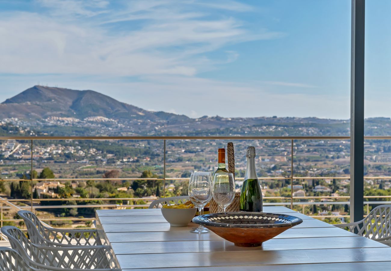 Bewaar het beste voor het laatst! Een gedeeltelijk overdekt terras loopt over de volledige breedte van het huis, met een overdekte bank en spectaculaire uitzichten op Jávea. Onder dit niveau lijkt het grote zwembad zich uit te strekken tot aan de horizon, wat uitnodigt tot lange, ontspannen dagen in de zon.