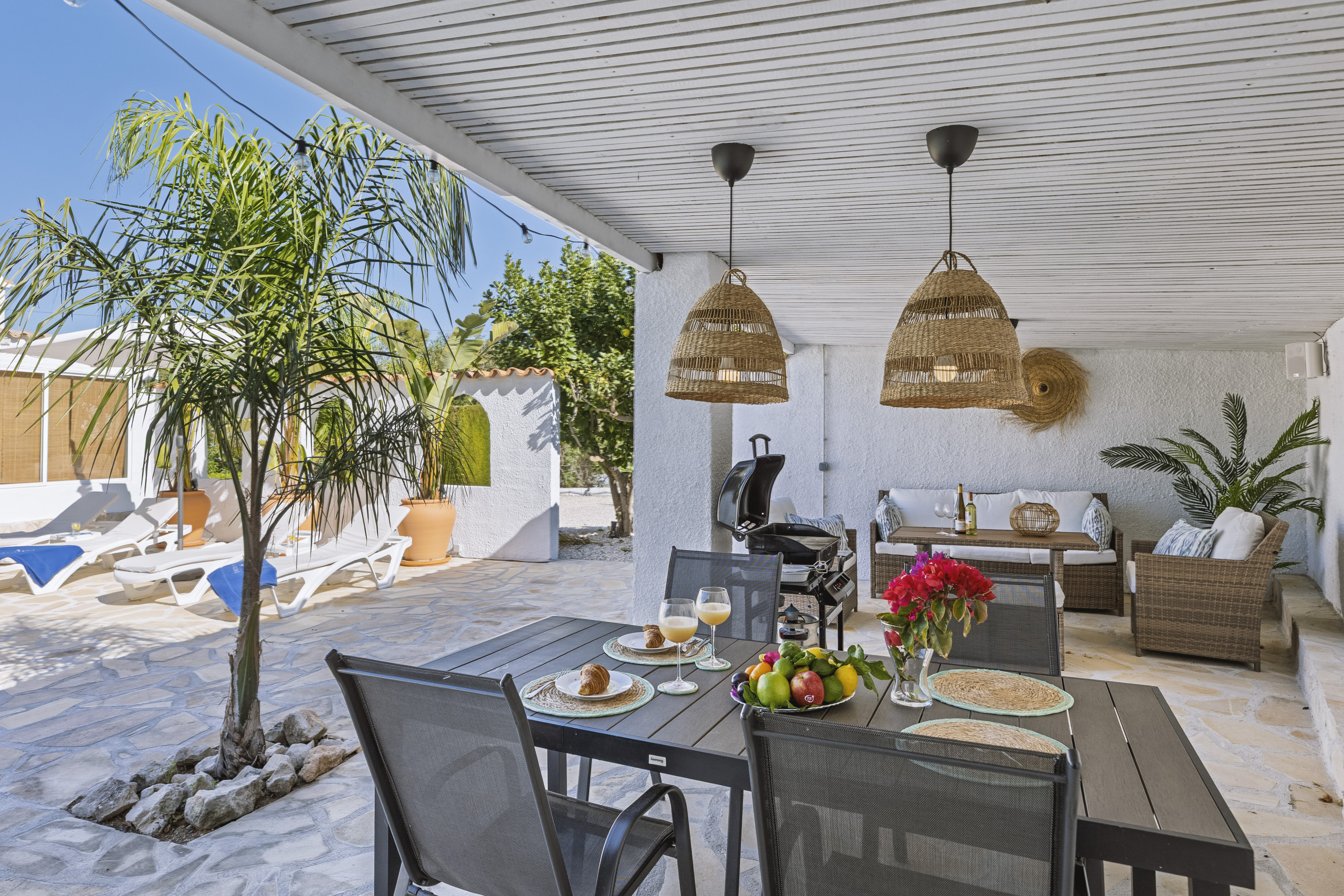 In het buitengebied omringen weelderige plantages en volwassen bomen het huis, waardoor schaduw en privacy worden geboden. Aan de ene kant bevindt zich een groot terras en het afgesloten zwembad, perfect voor ouders met kleine kinderen. Aan het einde van het terras staat de vrijstaande gasbarbecue en een geweldige overdekte eetkamer, ideaal om te dineren of gezelschapsspellen te spelen in de schaduw.