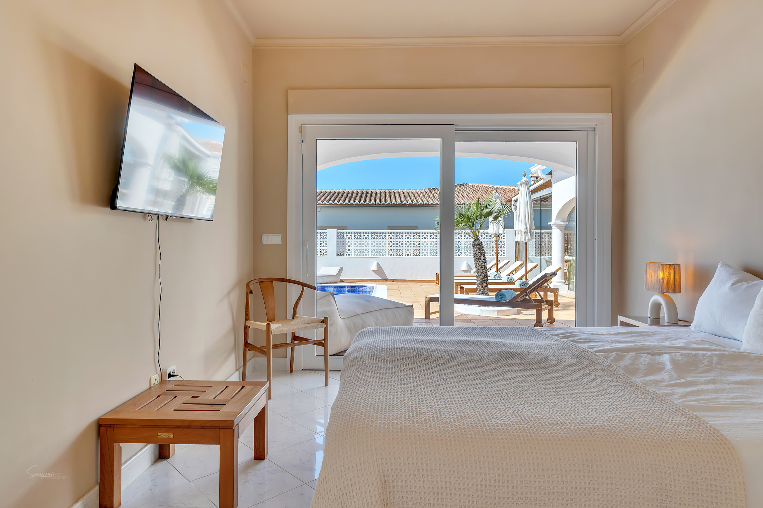 In het hart bevindt zich het privézwembad, groot genoeg voor luie drijvers en ochtendrondes, naast een aparte jacuzzi voor het ultieme genot. Het terras is ontworpen om de hele dag te ontspannen: koffie bij zonsopgang, cocktails bij zonsondergang en alles daartussenin.