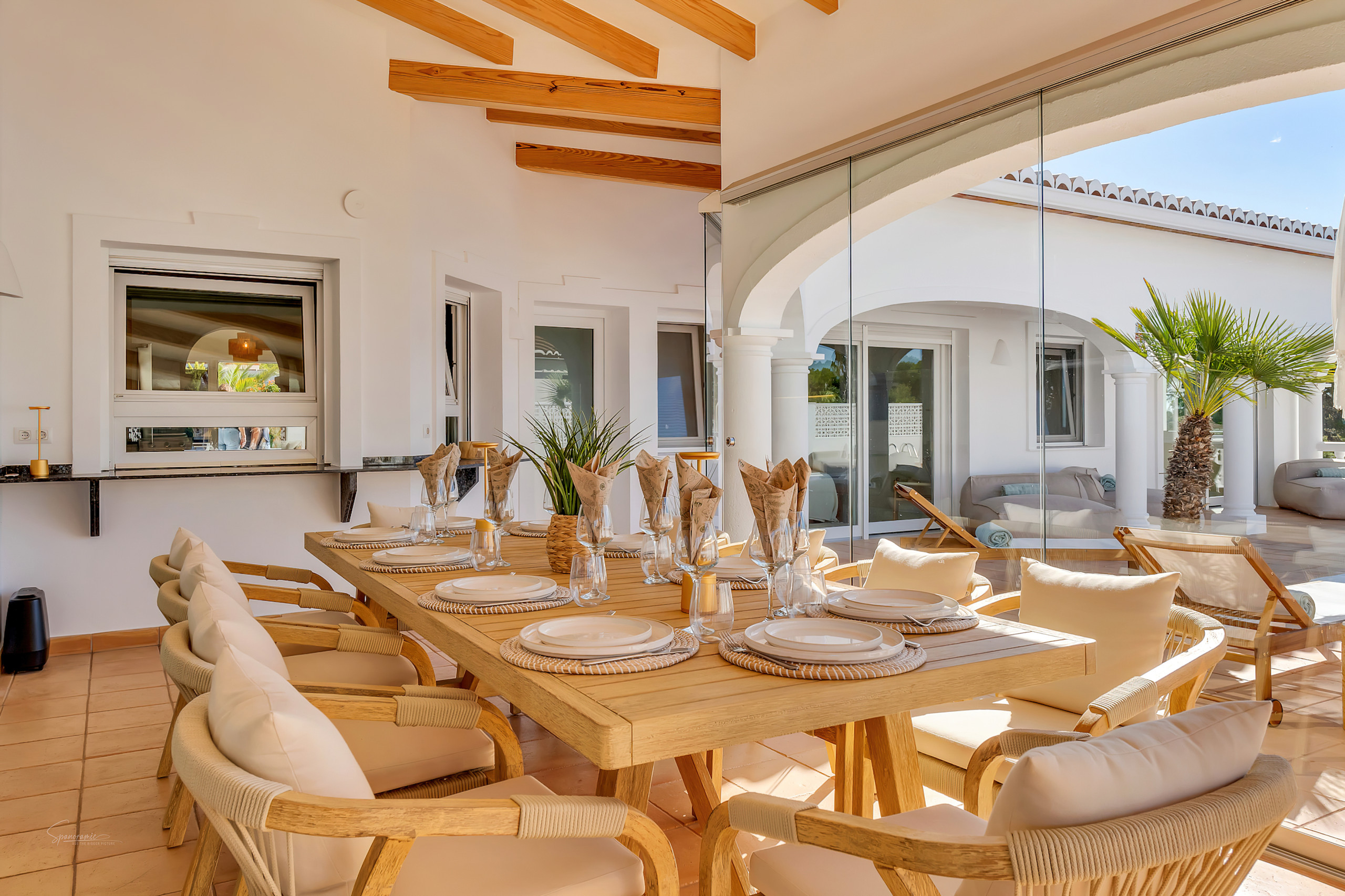 Externe gasten hebben veel opties voor entertainment. Een overdekt zitgedeelte naast de hoofdruimte is perfect om te lezen of van de tuinen te genieten, en aan het eind van het zwembad is er een groot overdekt loungegebied dat ideaal is voor drankjes na het diner of om kaartspellen bij het zwembad te spelen. Buiten de keuken biedt een even groot gebied een heerlijke familiedis voor buitenmaaltijden.