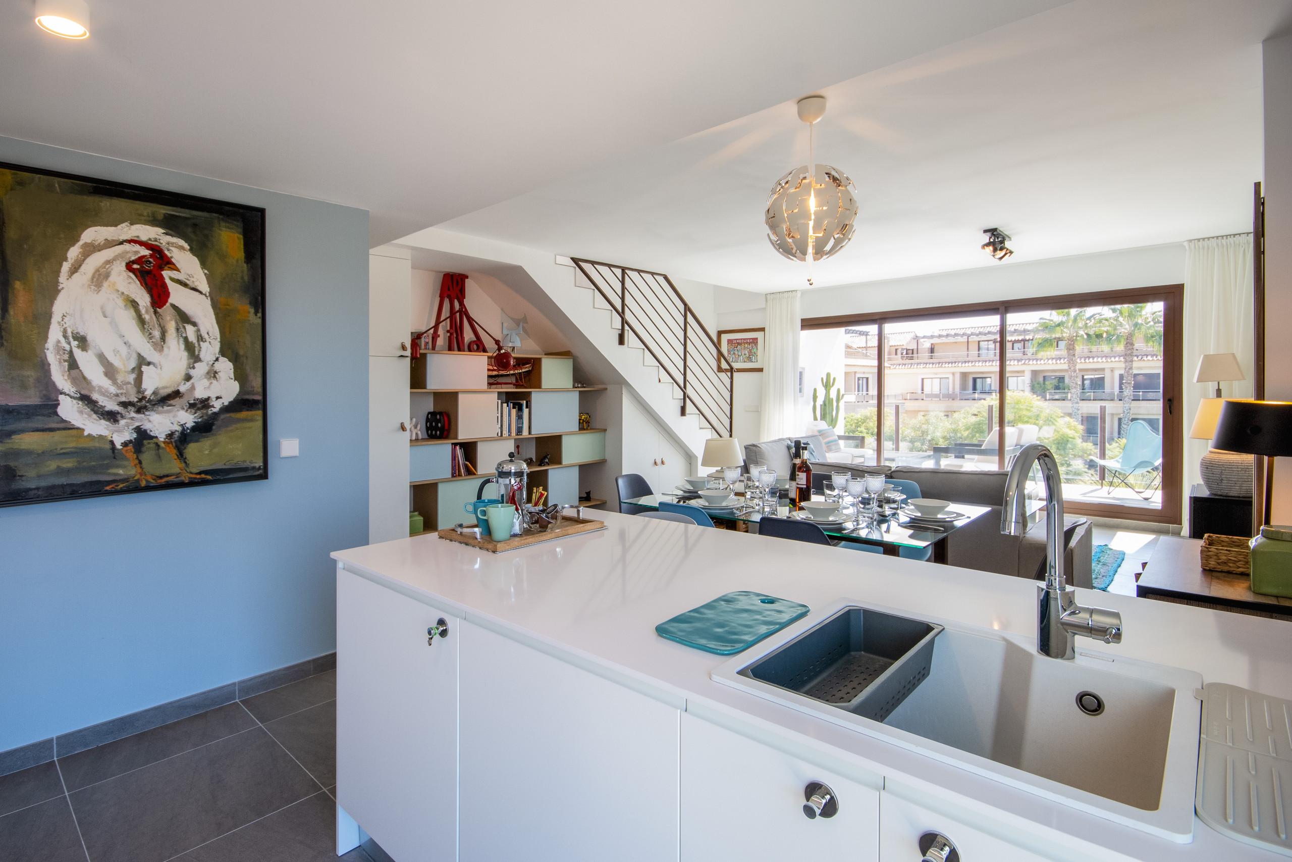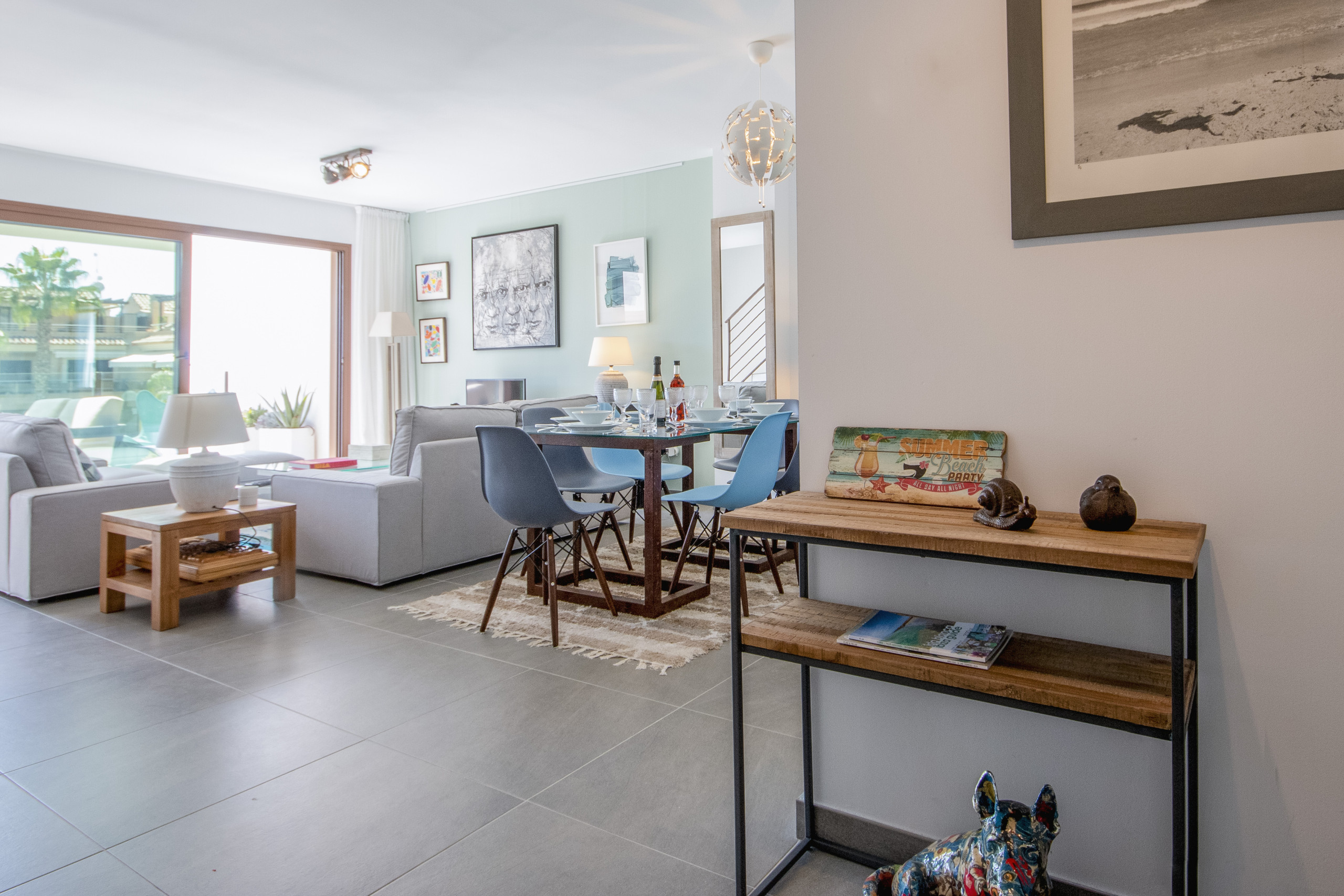 Dentro del apartamento, la gran cocina/salón/comedor es el espacio perfecto para reunirse para el desayuno, juegos de cartas o noche de películas en los cómodos sofás. Toma un café o cócteles antes de la cena en la amplia terraza cubierta, absorbiendo el aire marino y el ambiente relajado del barrio circundante.