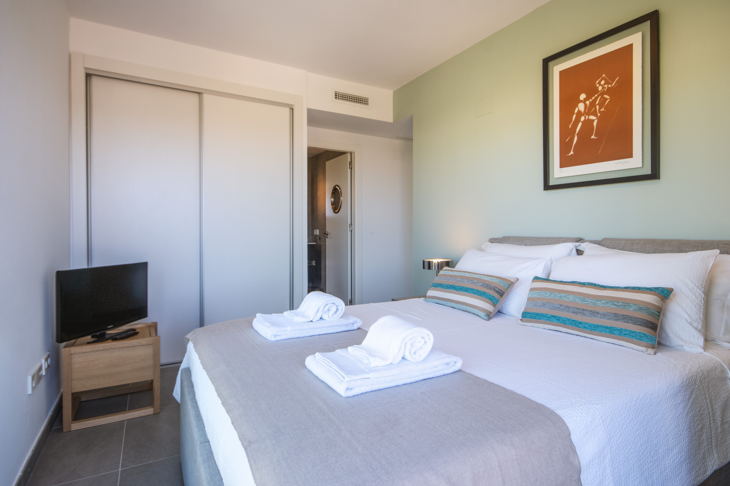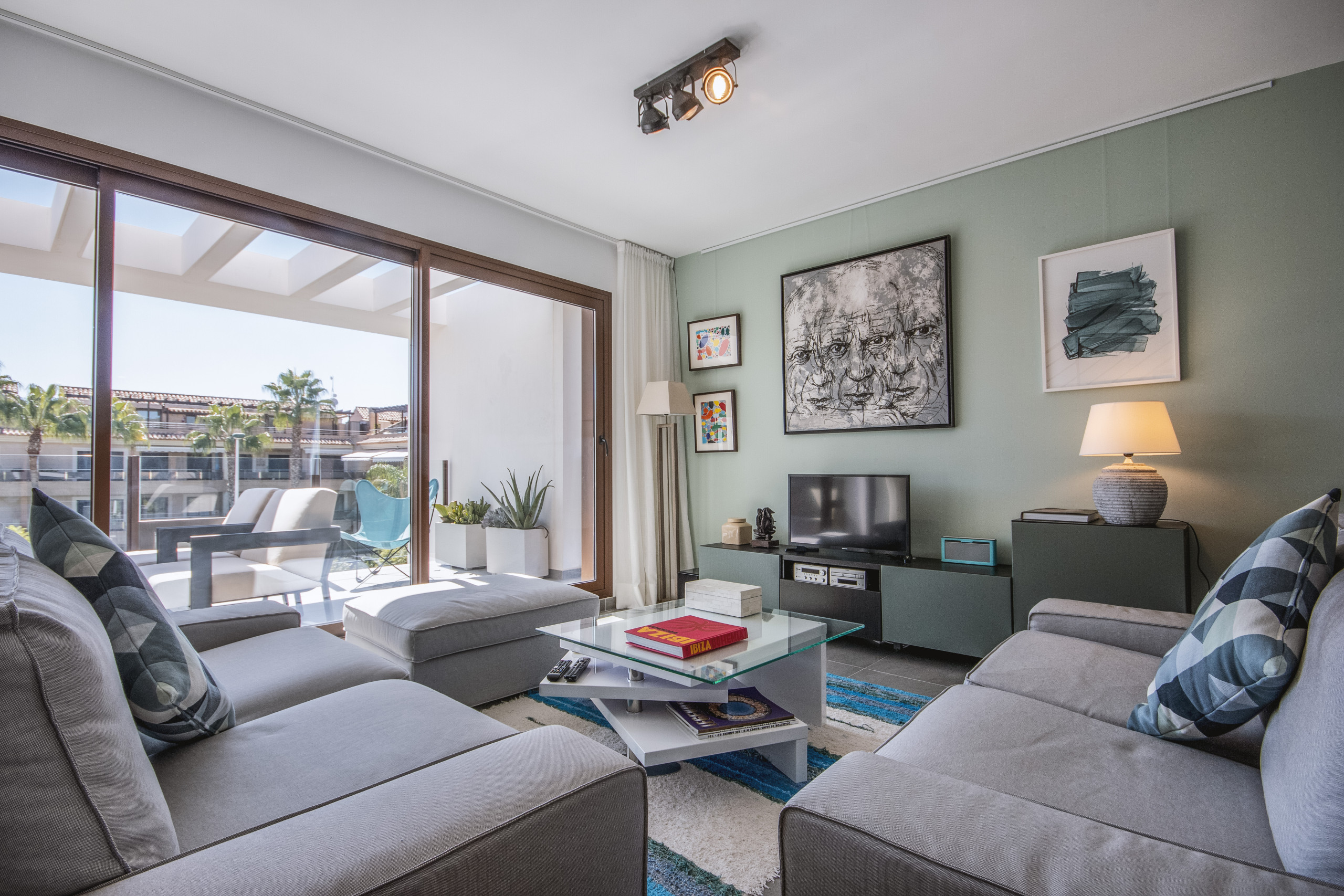 We had the penthouse modern stylish and well equipped we enjoyed the local supermarket most days light cooking at home ...10 min walk ...nearest beach bar was 10mins walk and we were ideally situated between the port and the arenal..for us we enjoyed the walk each day for 1 of our meals out ......may was unusually hot and the private terraces were very welcome ...recommend this apartment it's got style and personality home from home |