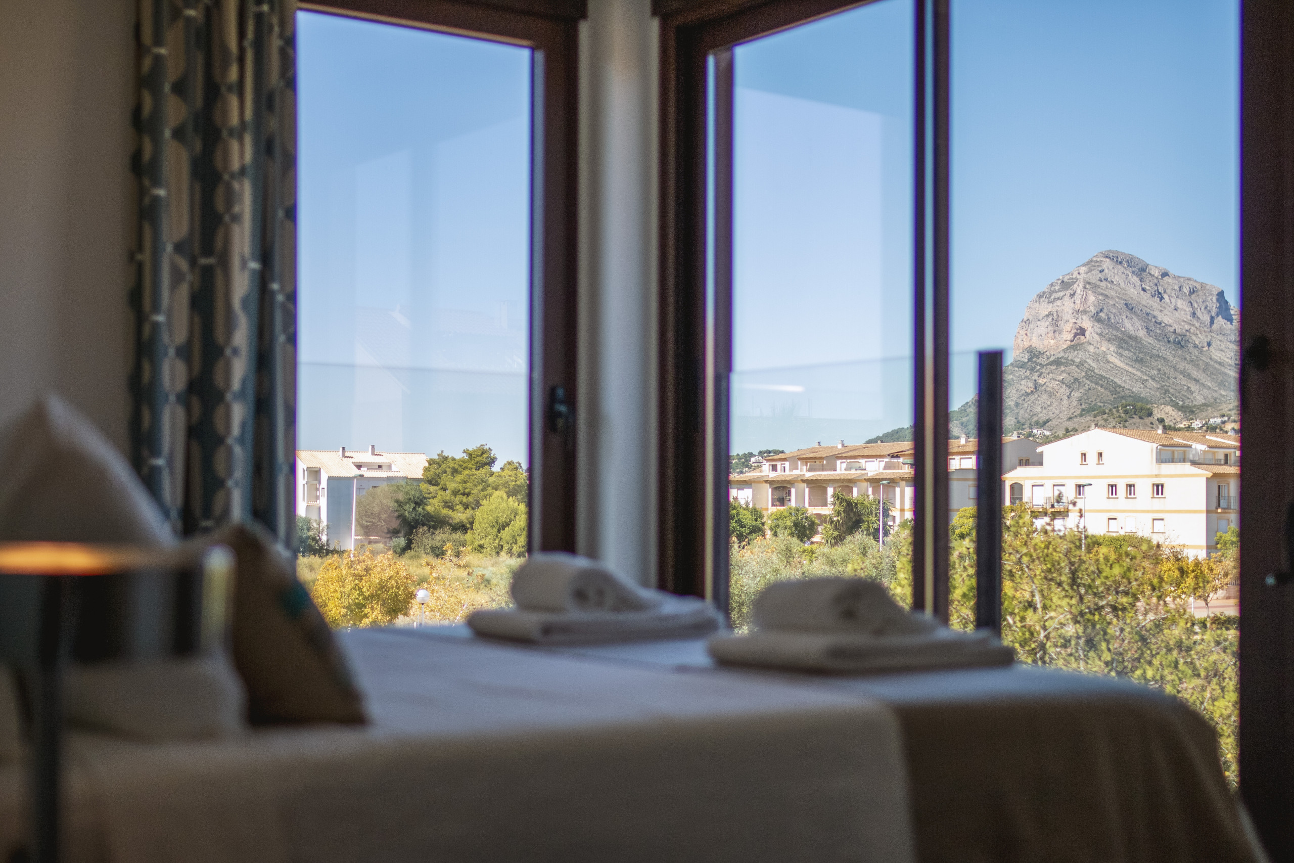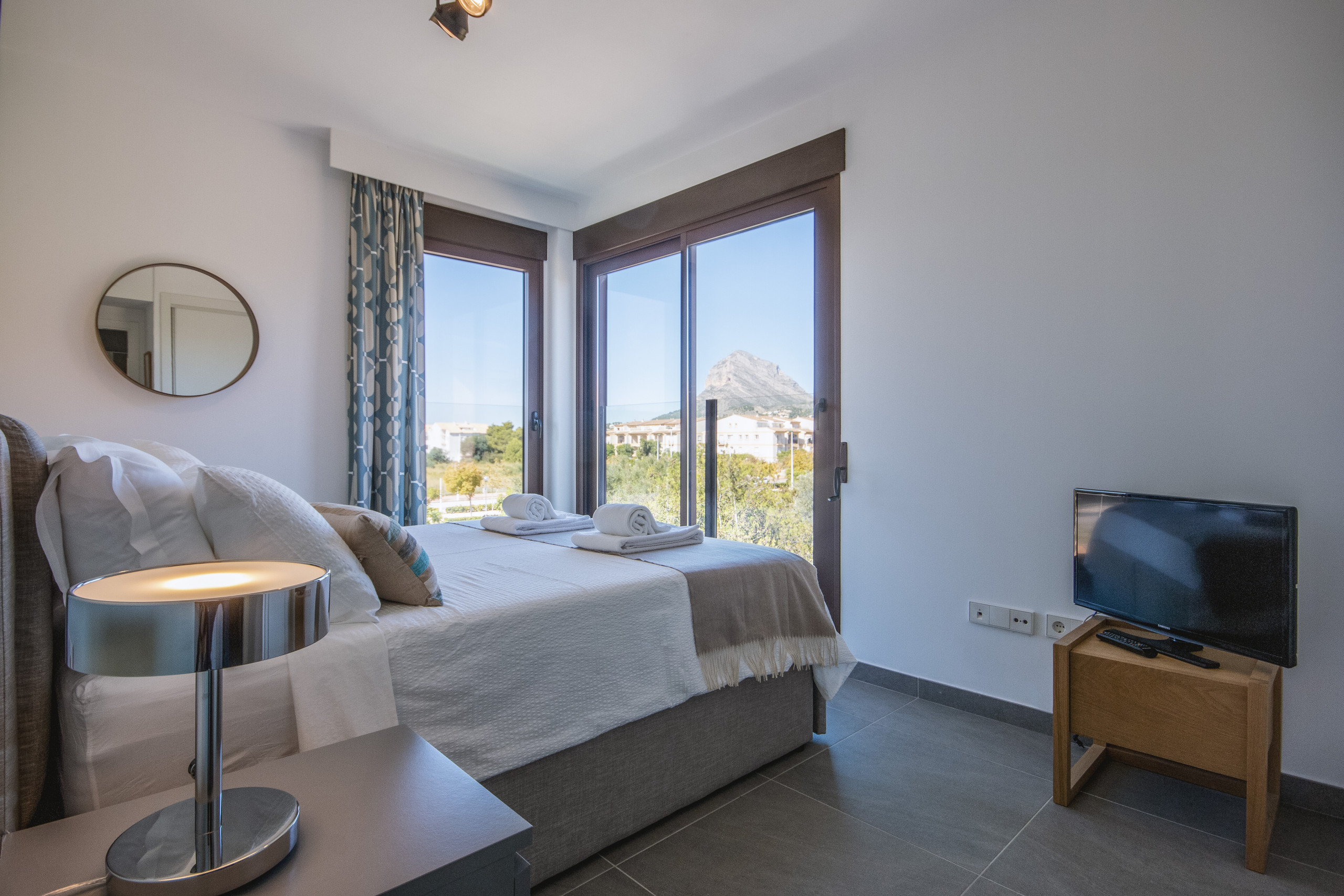 Dormitorios llenos de luz con vistas fabulosas al Montgó y a la campiña circundante proporcionan espacios relajantes y privados. Y los tres baños (dos de ellos en suite) ofrecen a los huéspedes amplias duchas de paseo, unidades de lavabo suspendidas y espejos elegantes con iluminación integrada. ¡El dormitorio de la planta superior tiene nada menos que dos terrazas exteriores, perfectas para leer un rato durante el día o contemplar las estrellas bajo el cielo nocturno!