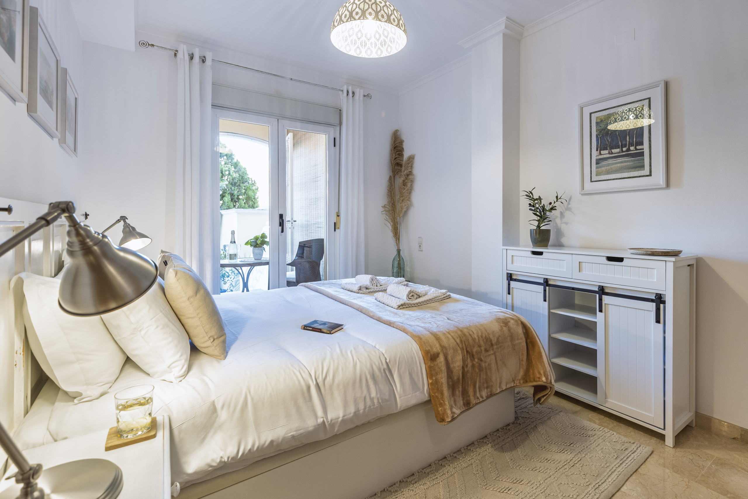 En el interior, la sala de estar es pequeña pero perfectamente diseñada e inundada de luz desde un balcón de altura completa que da a los tejados del complejo Pueblo Blanco II. En el mismo piso, el amplio dormitorio tiene su propio balcón, que ofrece vistas al mar y un magnífico baño en suite con una gran ducha a nivel del suelo, un práctico tocador y hermosas baldosas con patrones.