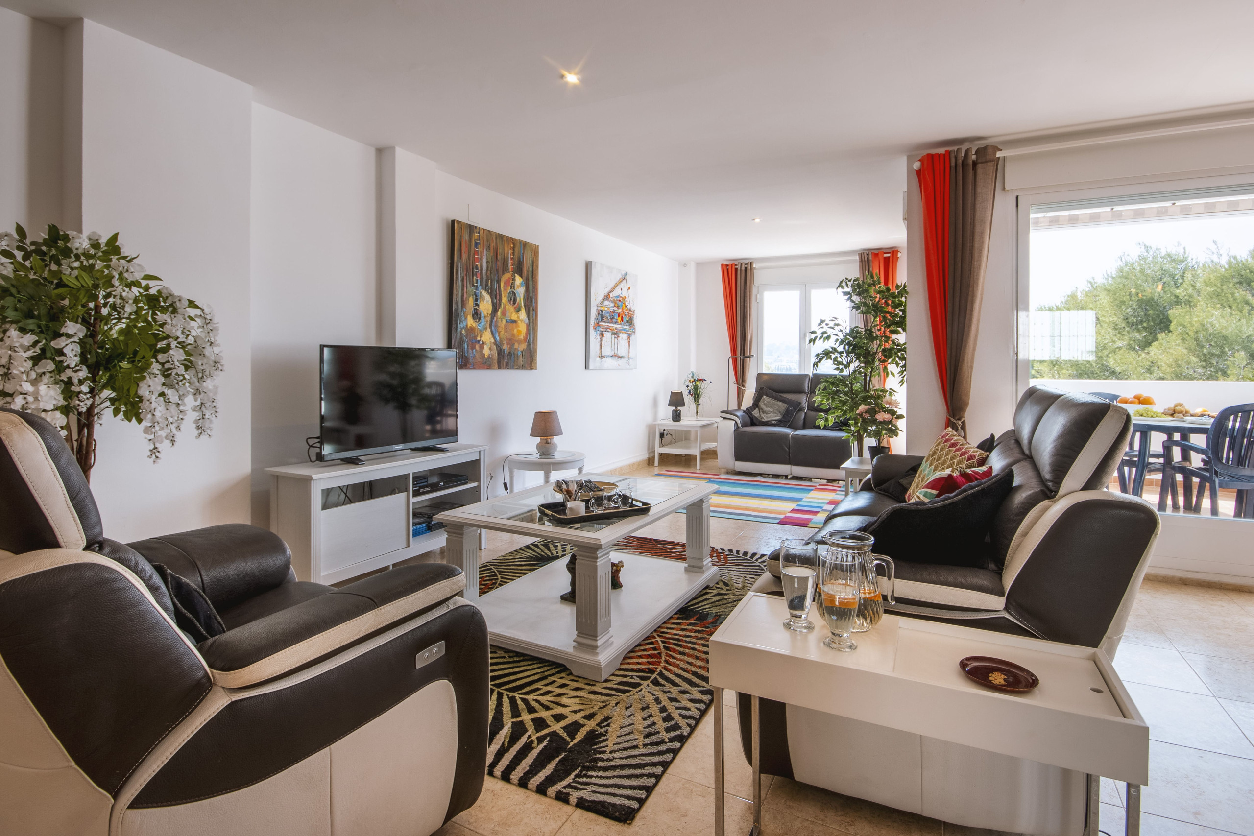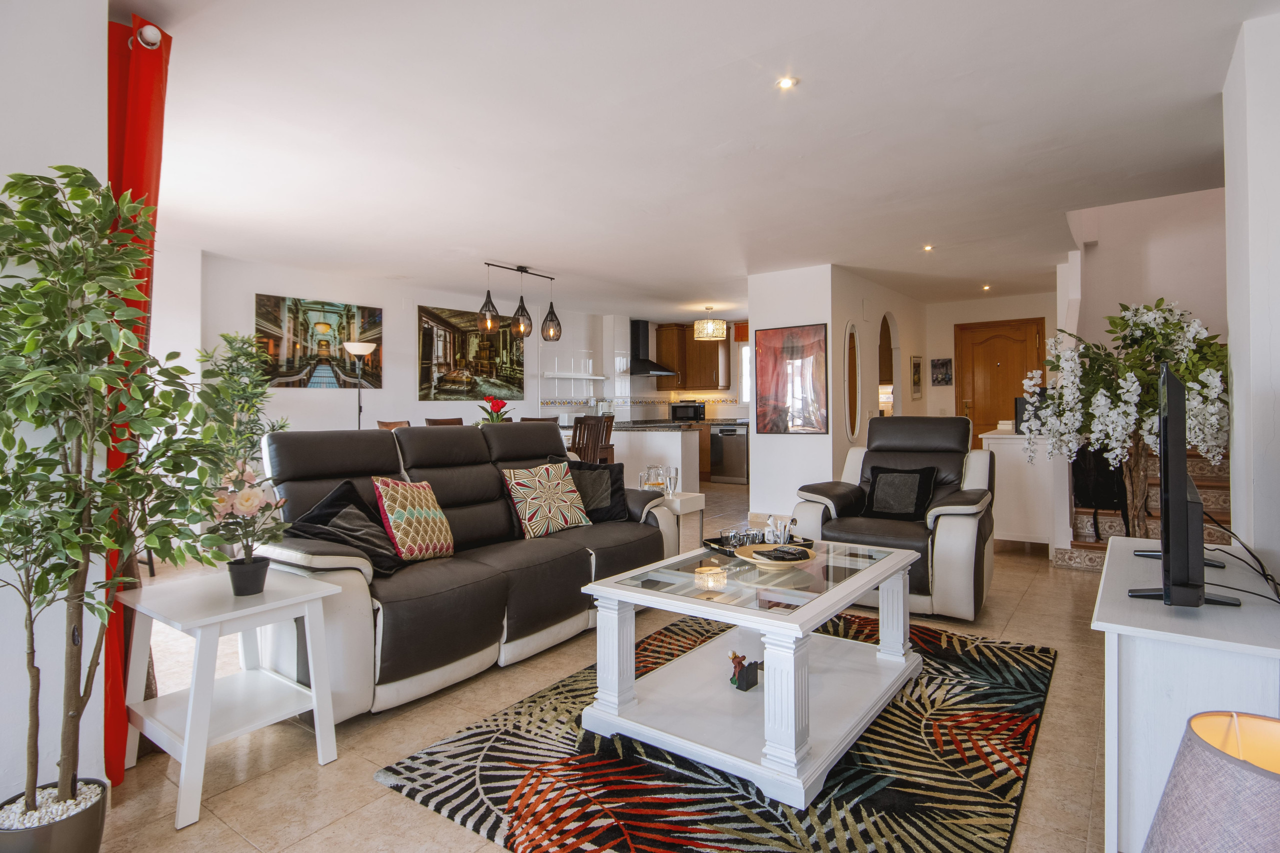 Dans l'appartement même, les vastes zones de salon et de salle à manger sont élégamment meublées et il y a une grande cuisine américaine bien située. Les chambres et les salles de bains sont au même niveau, deux des chambres ont les mêmes magnifiques vues que le salon et la terrasse. Remarque : la climatisation n'est disponible que dans le salon. Ventilateurs de plafond modernes pour les chambres.