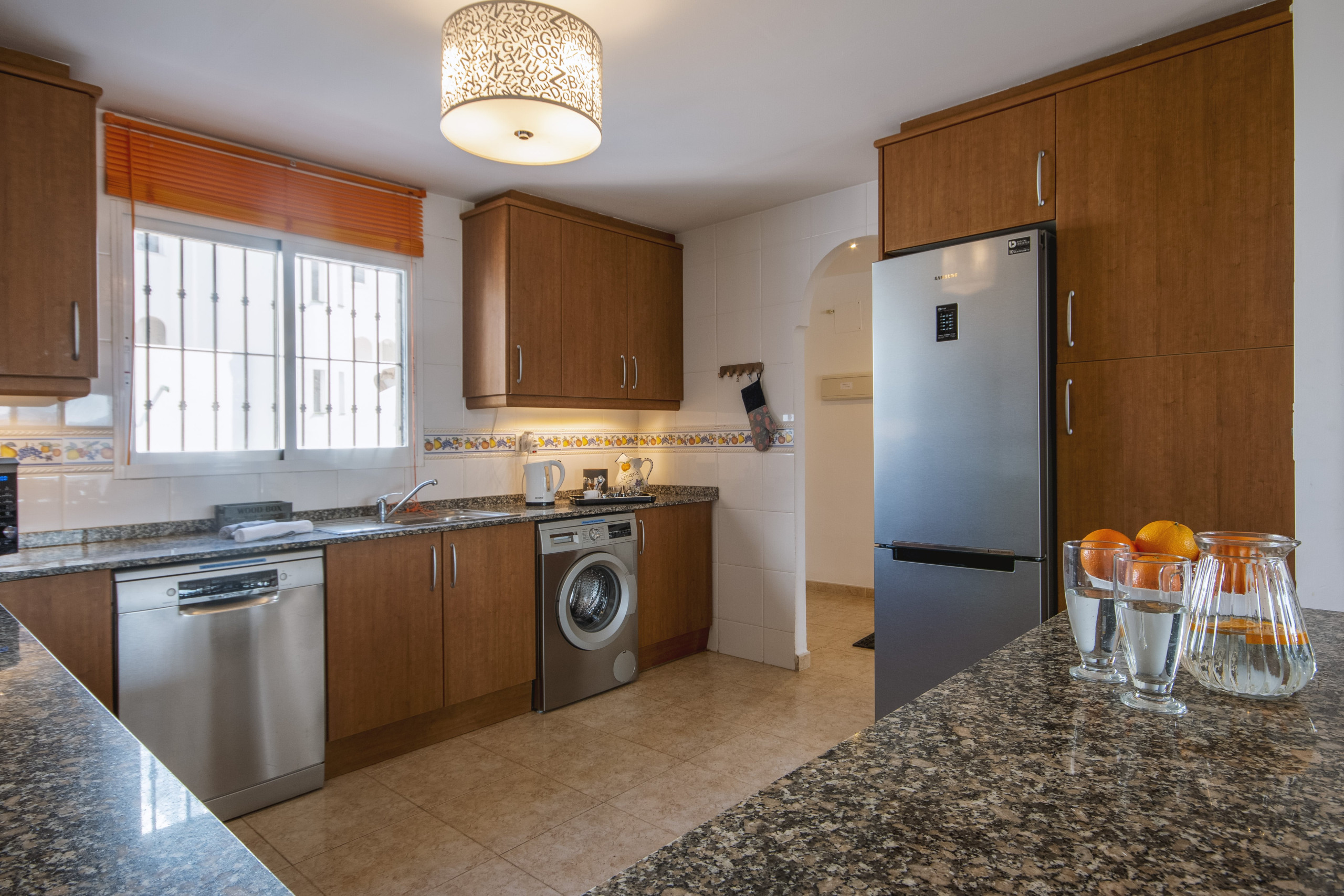 À l'intérieur de l'appartement, les invités sont accueillis par des murs blanchis lumineux, des œuvres d'art ensoleillées et de jolis touches décoratives en rotin et tons de plage. Le salon-salle à manger spacieux et la cuisine donnent sur un grand balcon couvert, avec une table de salle à manger extérieure et des sièges confortables. Les chambres élégantes disposent de placards intégrés et de lits de qualité avec des têtes de lit rembourrées. La climatisation chaud/froid est répartie dans toute la propriété par un système de ventilation à conduits, ce qui en fait un endroit confortable pour séjourner tout au long de l'année.
