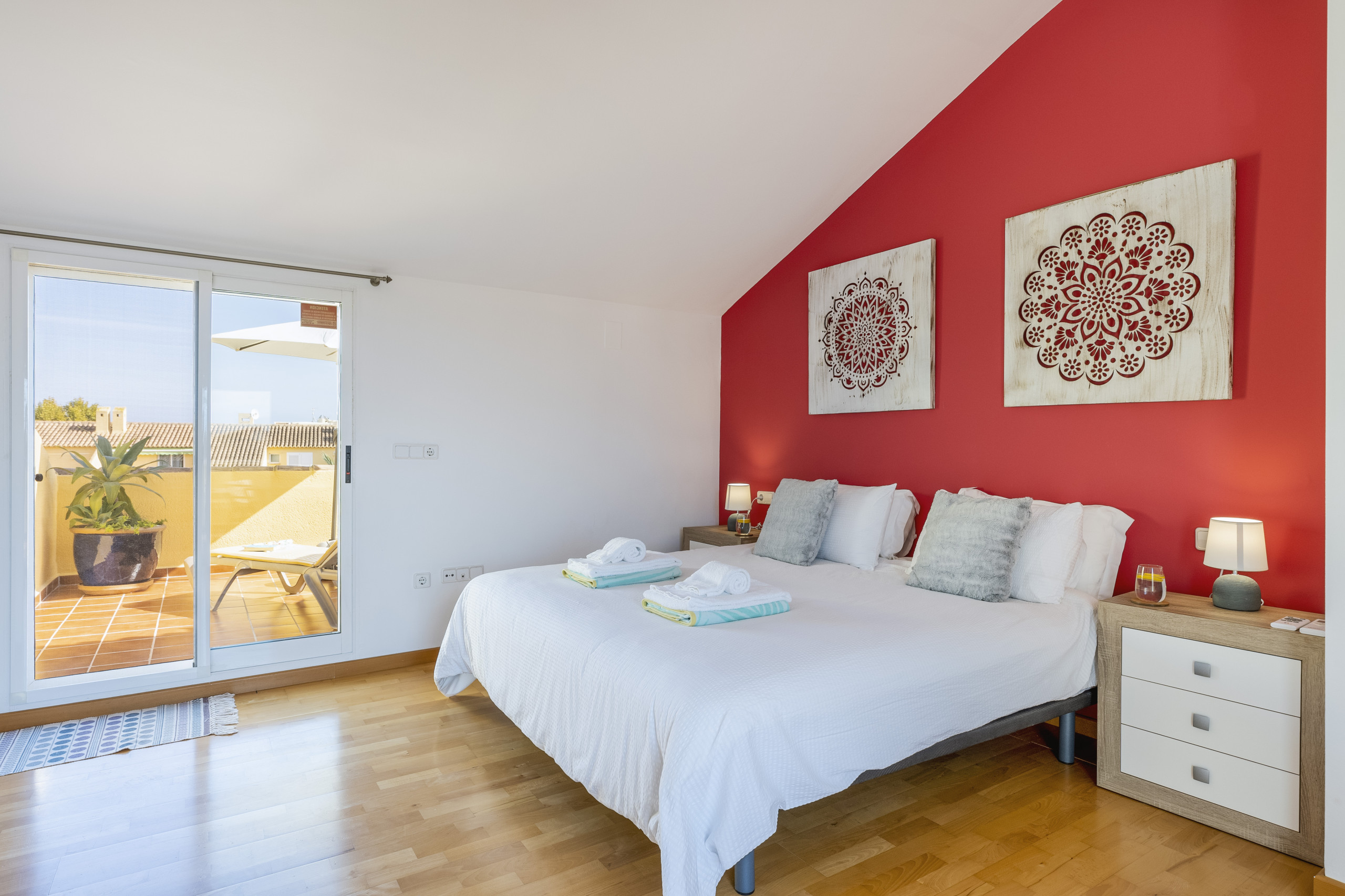 Au troisième étage, on accède à la chambre par un escalier intérieur. Son grand lit central et le plafond à double hauteur donnent à l'espace un sentiment de hauteur, tandis que la salle de douche en suite et le petit mais parfaitement aménagé placard intégré vous font sentir comme si vous veniez d'entrer dans votre propre suite d'hôtel de boutique. Les véritables stars du spectacle sont les deux balcons extérieurs, l'un avec des transats donnant sur les jardins intérieurs et la piscine, et l'autre avec des sièges extérieurs et des vues spectaculaires sur la montagne du Montgó de Jávea.