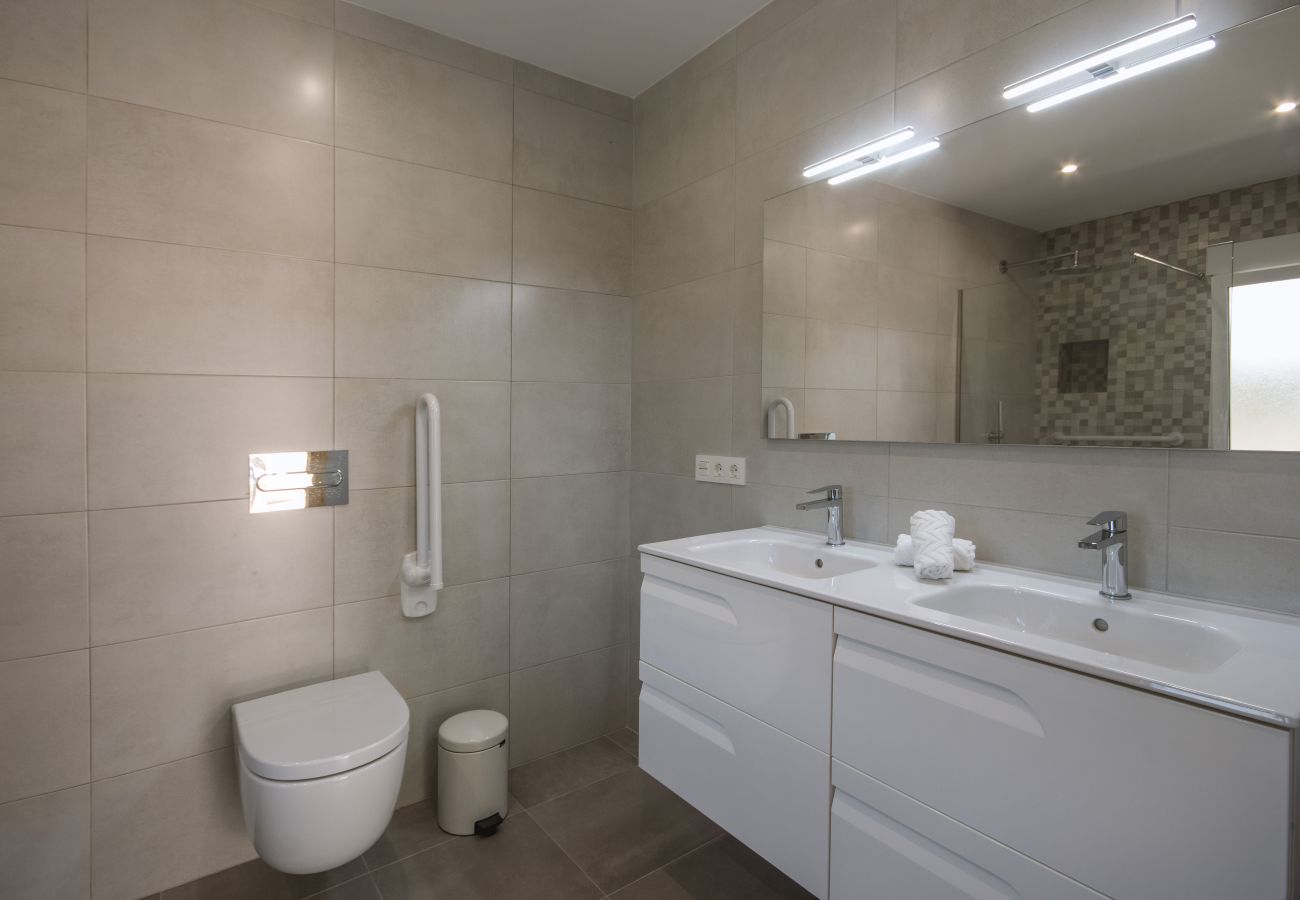 Réparti sur deux étages, au rez-de-chaussée se trouve une grande chambre principale avec salle de bain attenante et une chambre avec deux lits et une salle de bain indépendante, facilement accessibles depuis le salon, la cuisine et la zone de la piscine, ce qui rend ces deux chambres idéales pour les invités ayant des problèmes de mobilité. La chambre principale avec salle de bain est située au premier étage et bénéficie d'un fabuleux balcon orienté au sud avec vue sur la piscine et les jardins.
