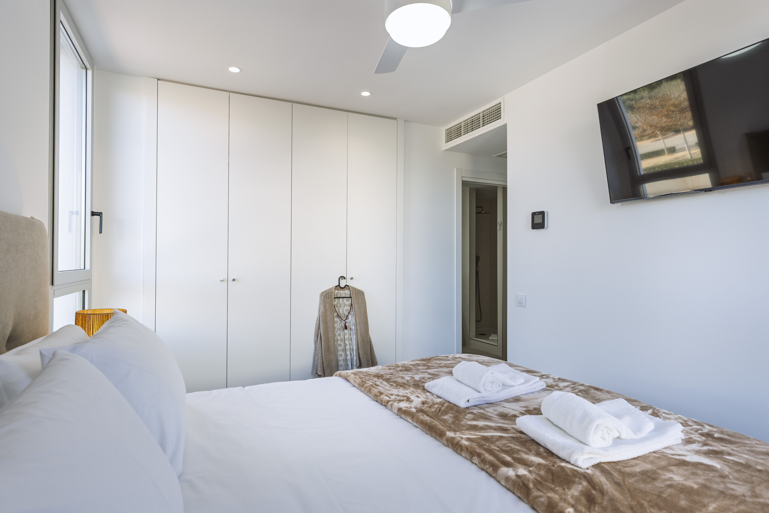 Inside the apartment, guests are welcomed by bright whitewashed walls, sunny artworks and lovely decorative touches in rattan and beach tones. The spacious living-dining room and kitchen overlook a large covered balcony, with an outdoor dining table and comfortable seating. The elegant bedrooms feature built-in wardrobes and quality beds with padded headboards. The cold/heat air conditioning is distributed throughout the property via a ducted ventilation system, making it a comfortable place to stay all year round.