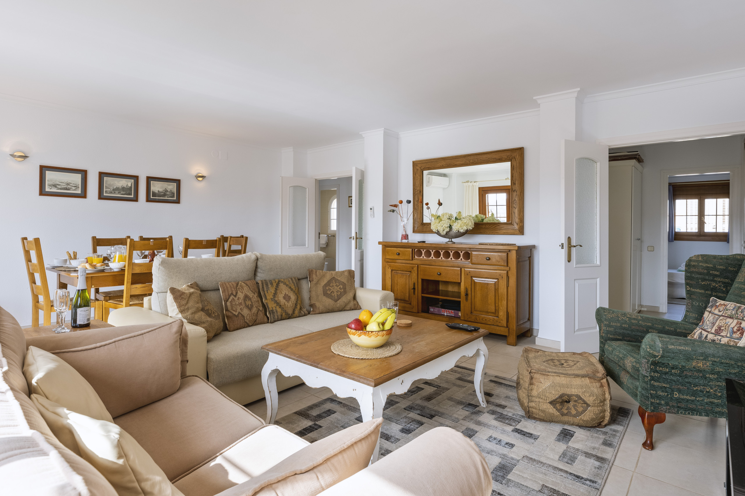 Inside, the apartment offers two spacious bedrooms, one double and another with two beds, with the possibility of a fifth folding bed if necessary. The spacious living-dining room opens onto the terrace overlooking the pool and gardens and is perfect for outdoor dining. The kitchen is modern and has all the necessary appliances to prepare and cook meals for the family. The kitchen is modern and has all the necessary appliances to prepare and cook meals for the family. The apartment also has hot and cold air conditioning units in the living room and hallway, and ceiling fans in the bedrooms.