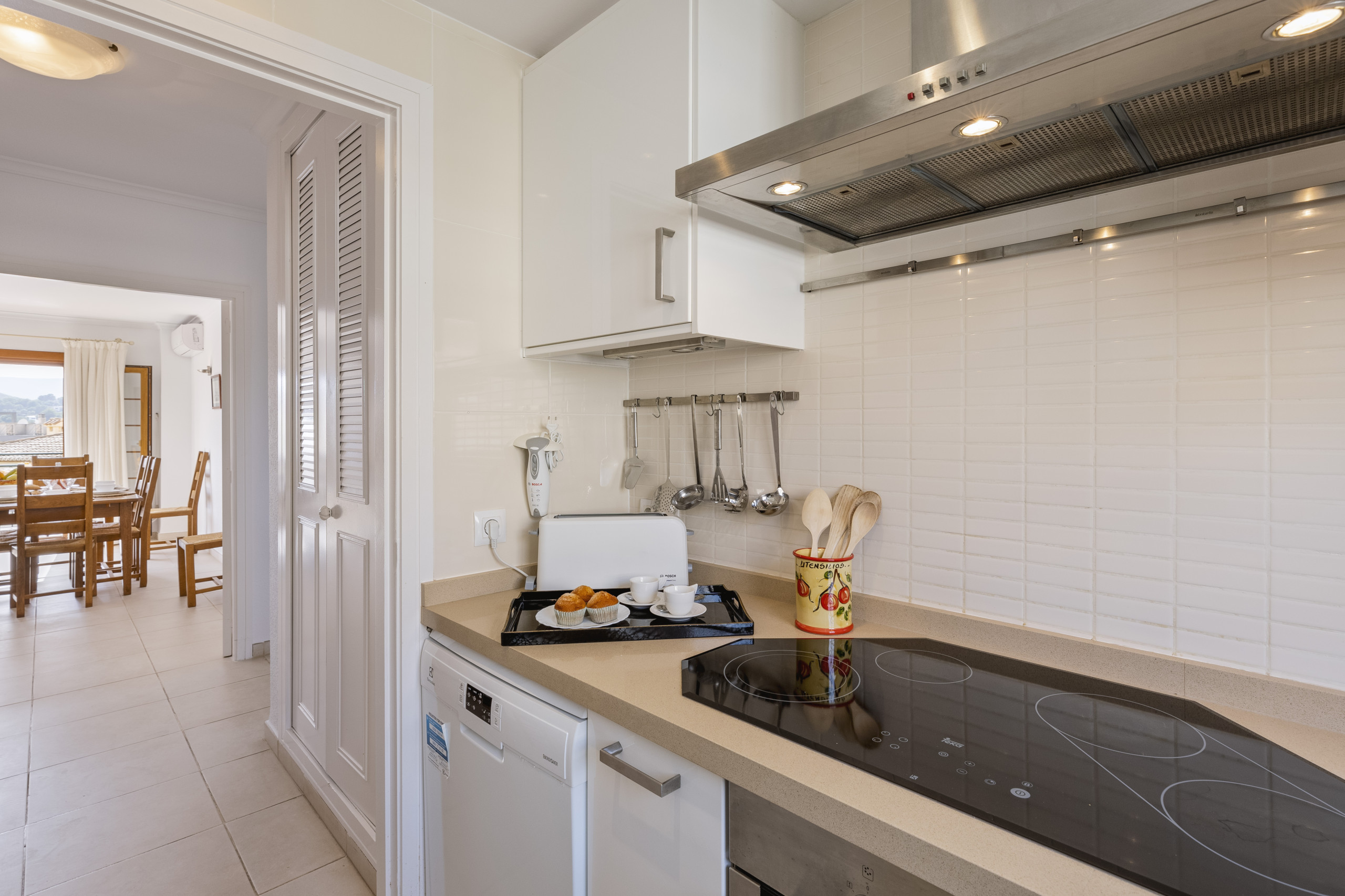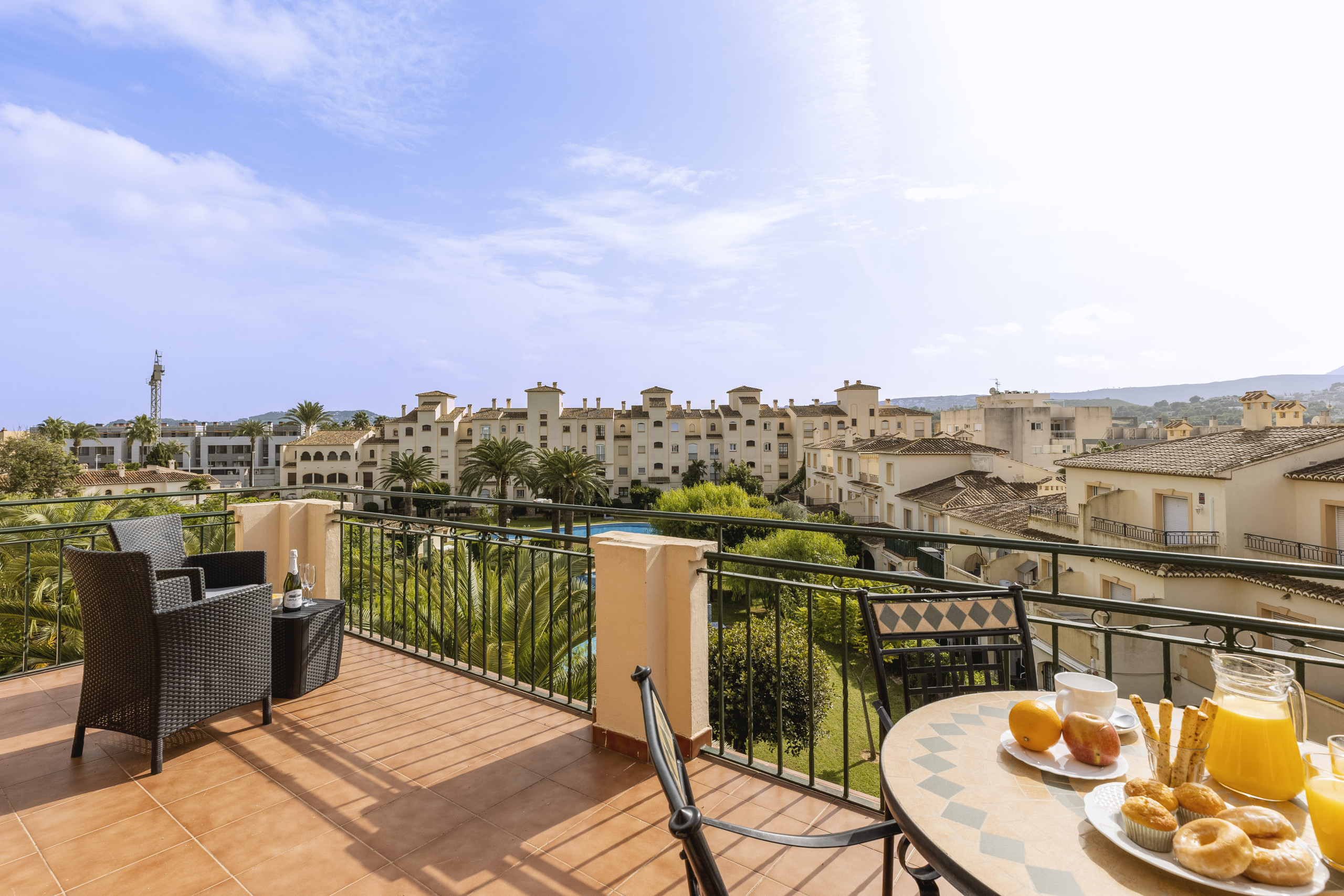 Inside, the elegant open kitchen with an American-style breakfast bar looks out onto the spacious living/dining room, with a comfortable corner sofa and wooden dining table. Outside, the outdoor balcony offers guests al fresco dining with views of the Montgó and the Jávea countryside. The perfect space for fresh lunches under the retractable awning, or star-lit dinners on warm summer nights.