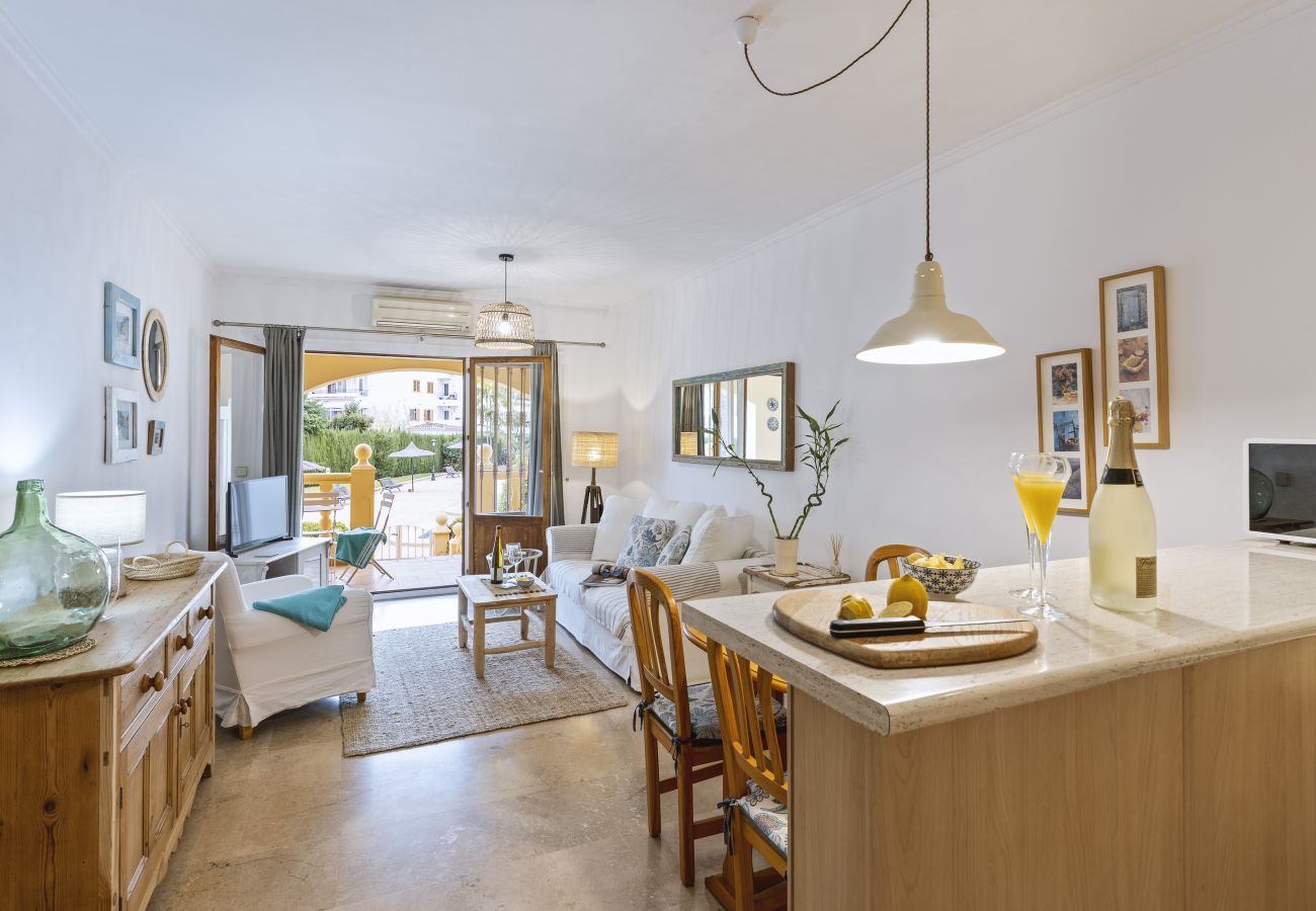 Located on the ground floor of Jardines del Sol I, the apartment has direct access through a small courtyard to the swimming pool and communal gardens, gleaming with mature olive trees, beautiful plantations and lawn. Climbing a few steps from the outdoor courtyard, a lovely covered terrace with a dining table and chairs overlooks the gardens and pool, and offers a shaded spot to take refuge from the sun's rays.