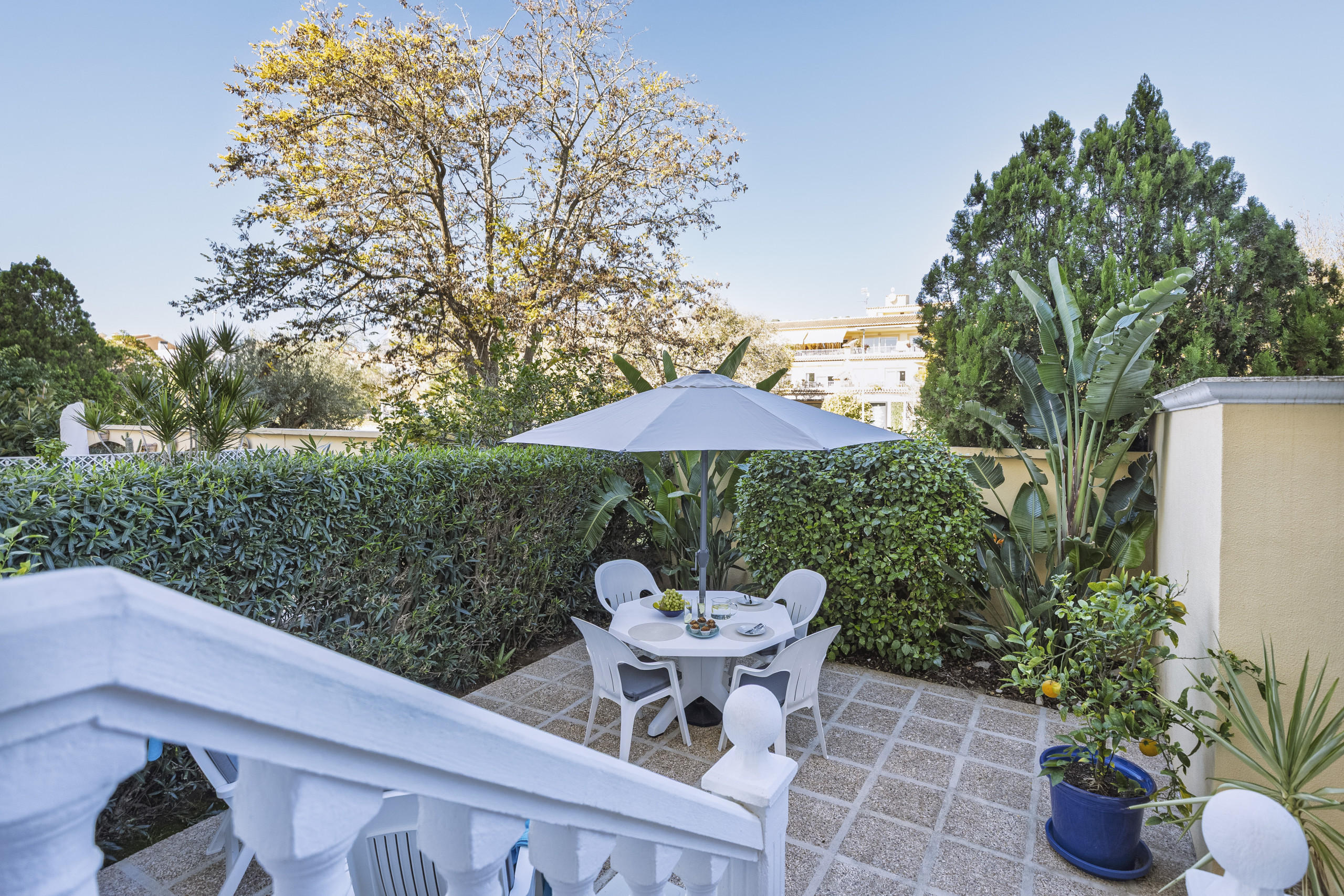 This beautiful one-bedroom apartment in Ibizan style is a step away from the rocky beaches of Montañar II in Jávea, and a 10-minute walk from the main sandy beach, bars and restaurants of the popular Arenal.